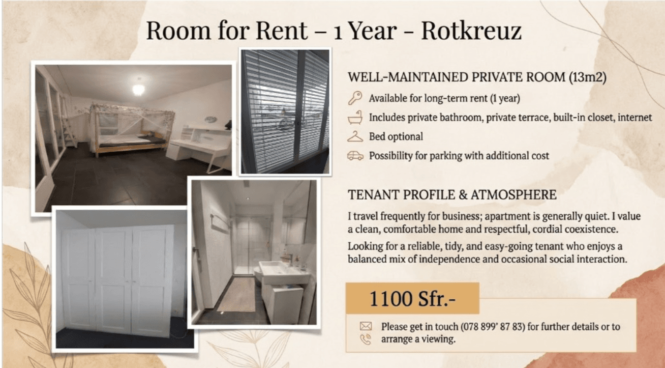 Ab Februar2 Tage onlineI am leaving my room in the center of Rotkreuz, close to the station, the shops and all the activities.