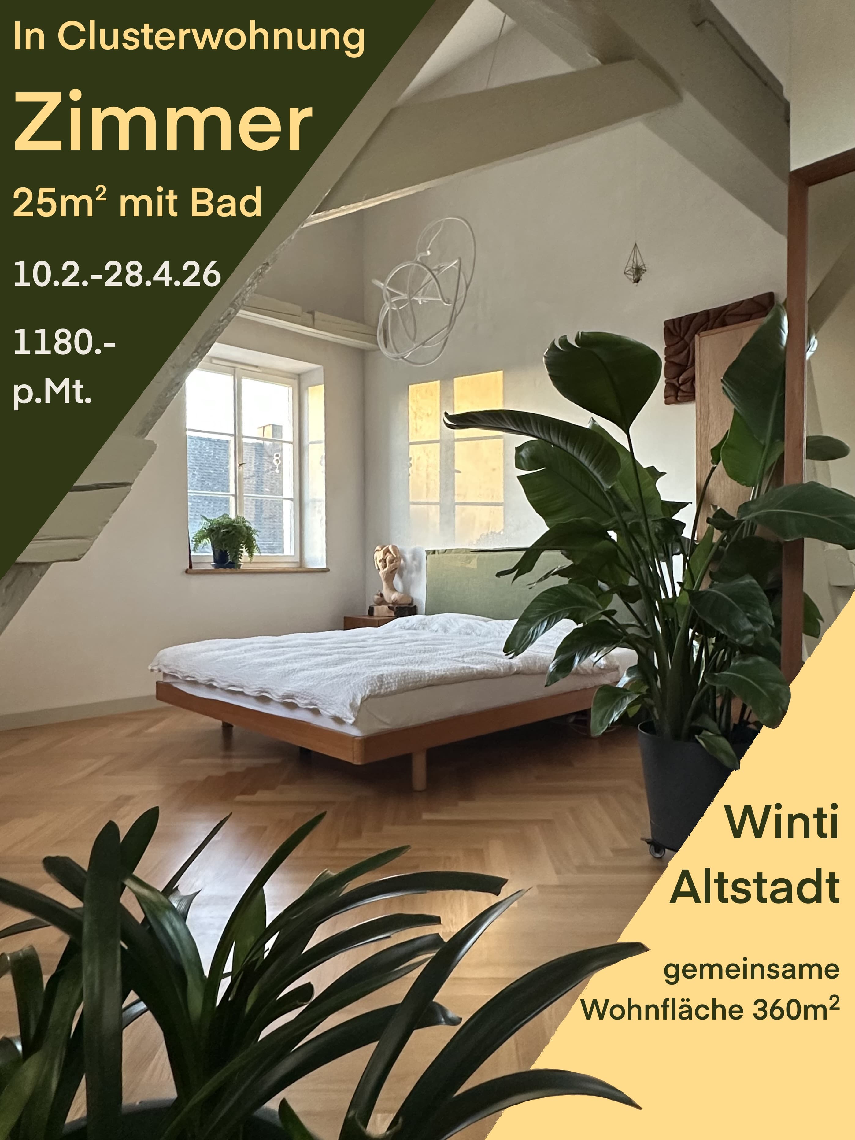 2 Wochen onlineonline.since 2 Wochen5 Gehminuten vom Bahnhof Winti haben wir ein Zimmer frei in unserer kleinen Oase mit Garten.Waschmaschine in der WohnungGeteiltes WifiGarten zur MitbenutzungGeschlecht egalHaustiere vorhanden und/oder erlaubtunmöbliertLeute mit WG-Erfahrung bevorzugt