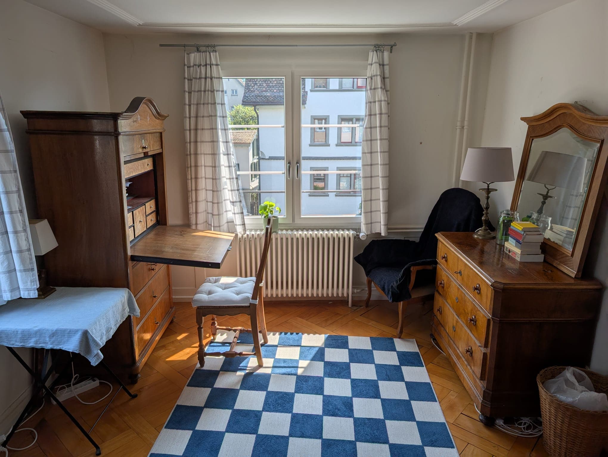 Ab OktoberVerfügbar ab 30.10.20253 Tage onlineonline.since 3 TageA bright, large room in a shared apartment with 3 nice roommates. The room is fully furnished (bed, desk, wardrobe, bookshelf).Wohnung hat einen Balkon oder eine TerrasseZimmer ist voll möbliert, eventuell können noch eigene Möbel mitgebracht werdenNur Frauen, oder Frauen bevorzugt1299CHF / 13m²