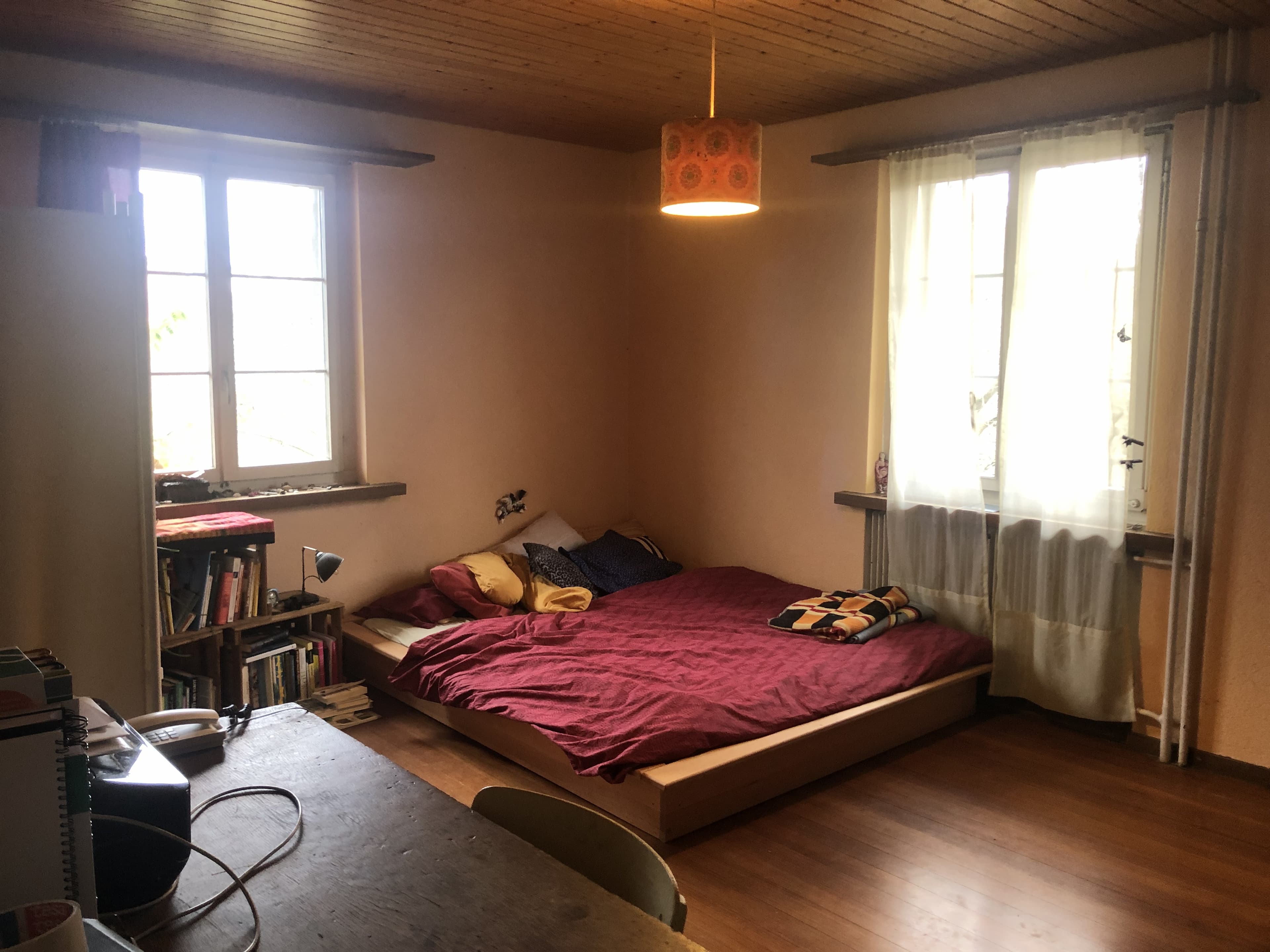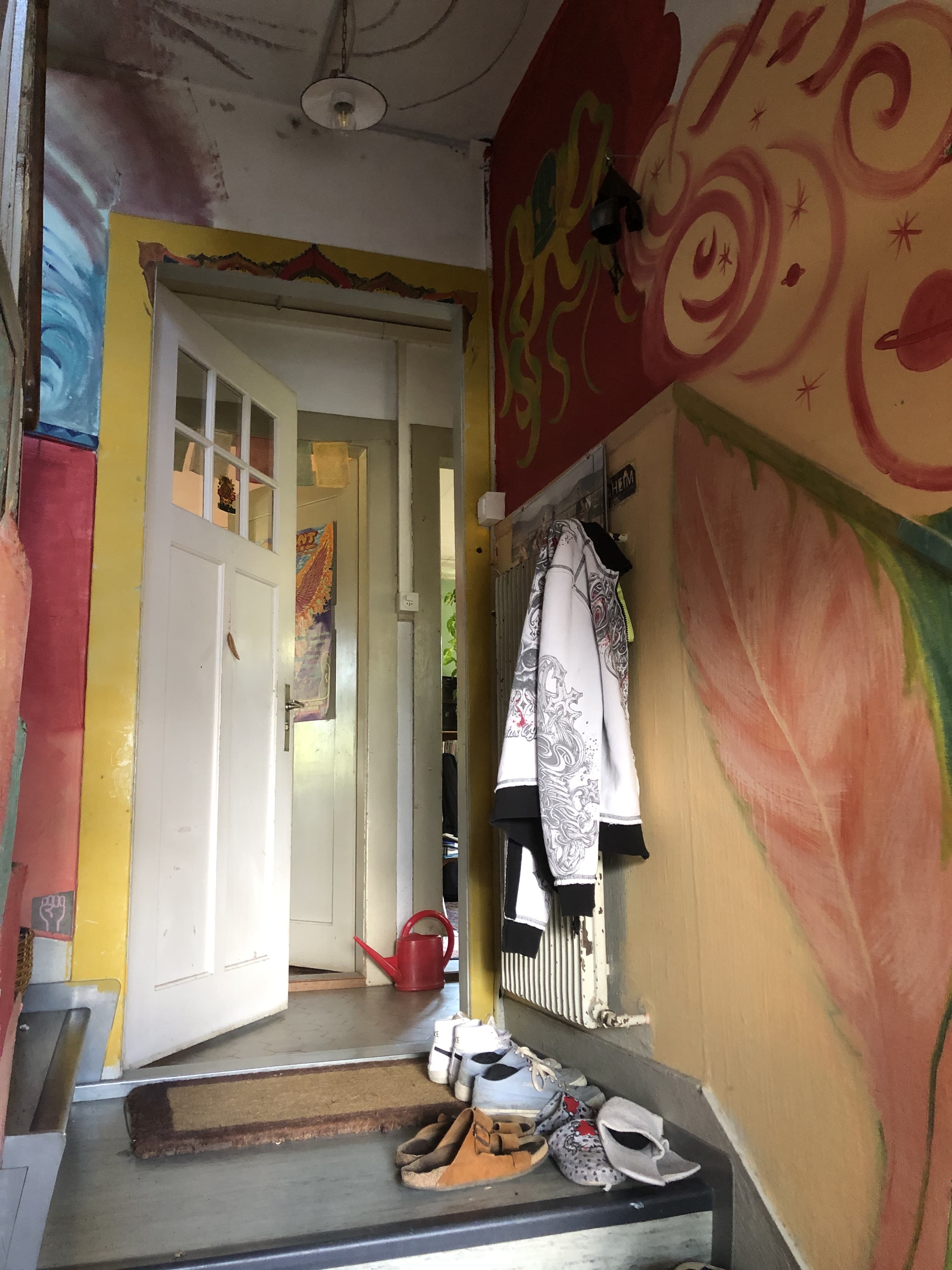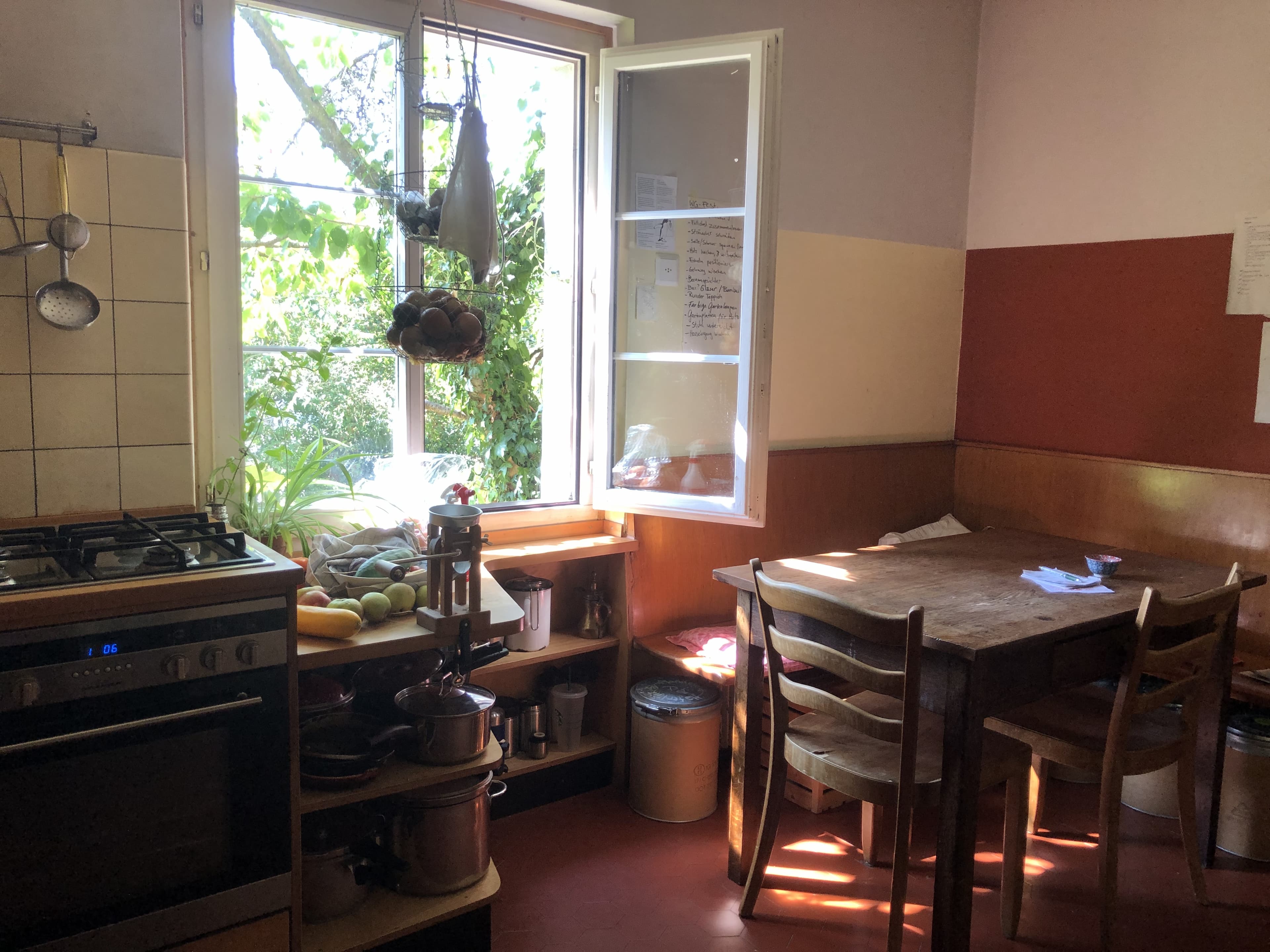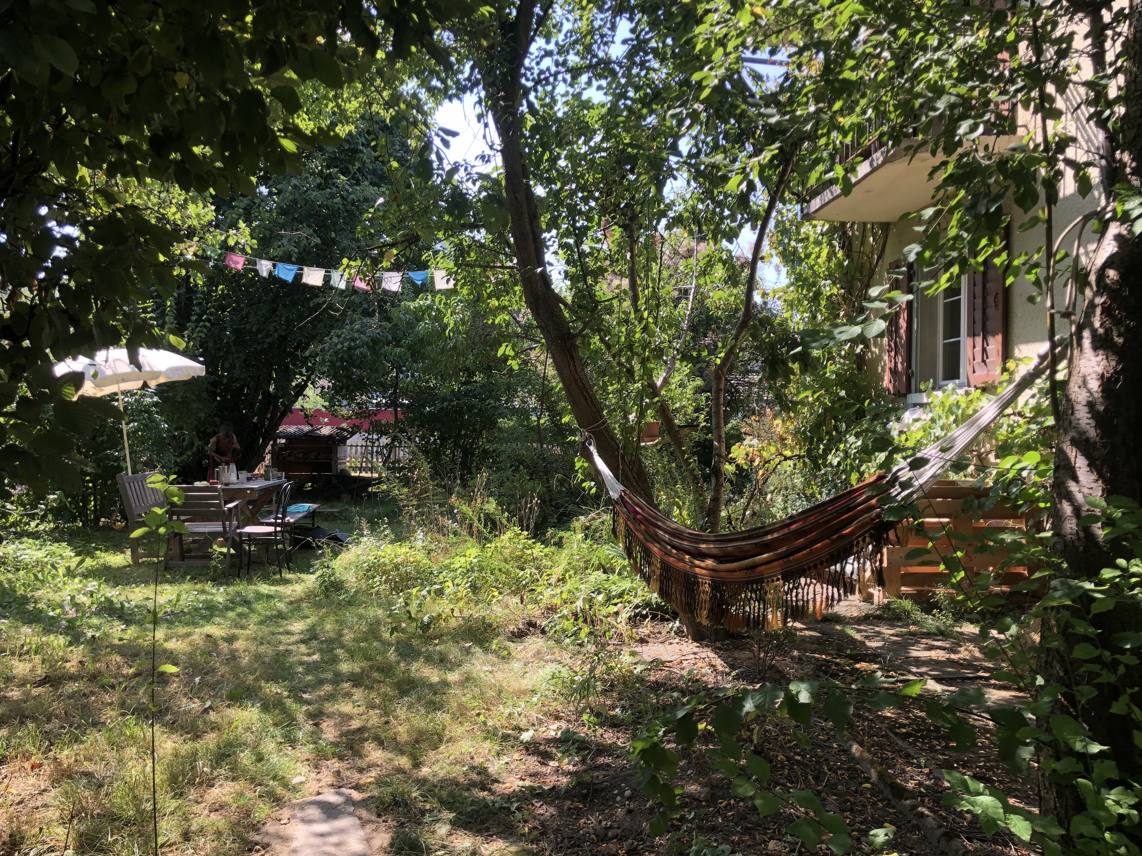 Wir teilen uns zwei Wohnungen mit einer Gemeinschaftsküche, einer Produktionsküche, einem gemeinsamen Wohn-/Esszimmer, ein Rückzugs-Wohnzimmer, zwei Badezimmer, einen Musikraum, Waschküche, Werkraum, zwei Estrichabteile und einen grossen Garten.