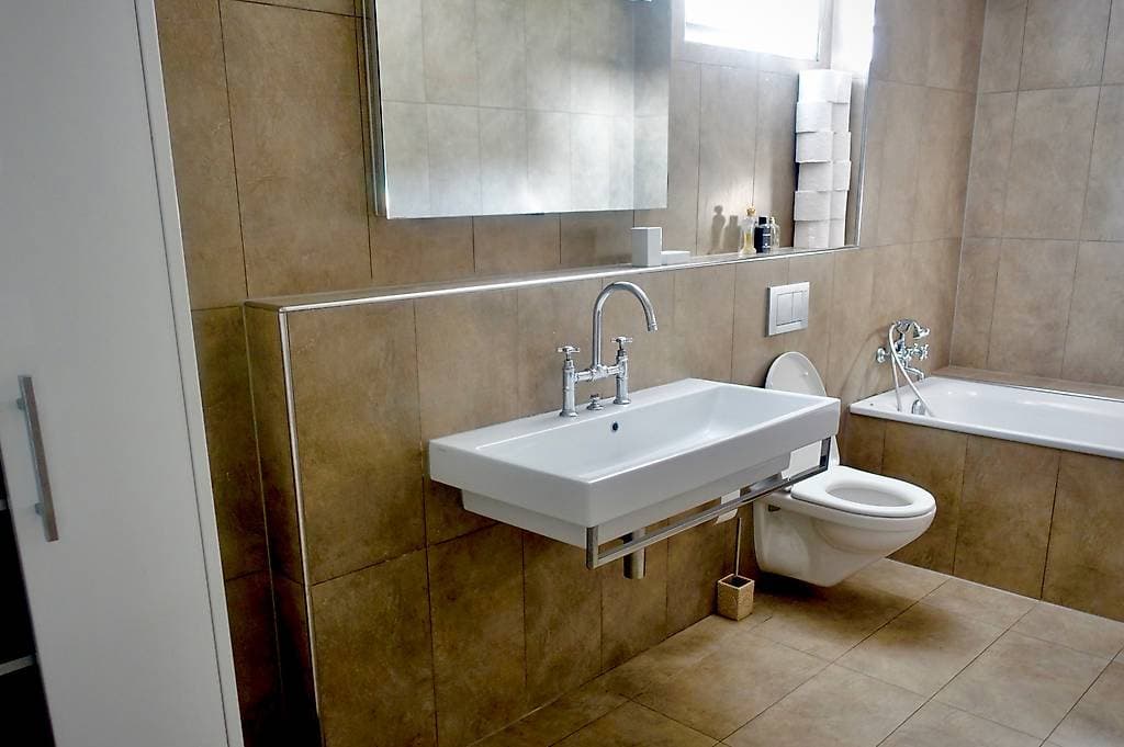 8m2 Bad mit WC, Badewanne, Doppellavabo und Schrank auf derselben Etage (muss mit einem weiteren Mitbewohner geteilt werden)