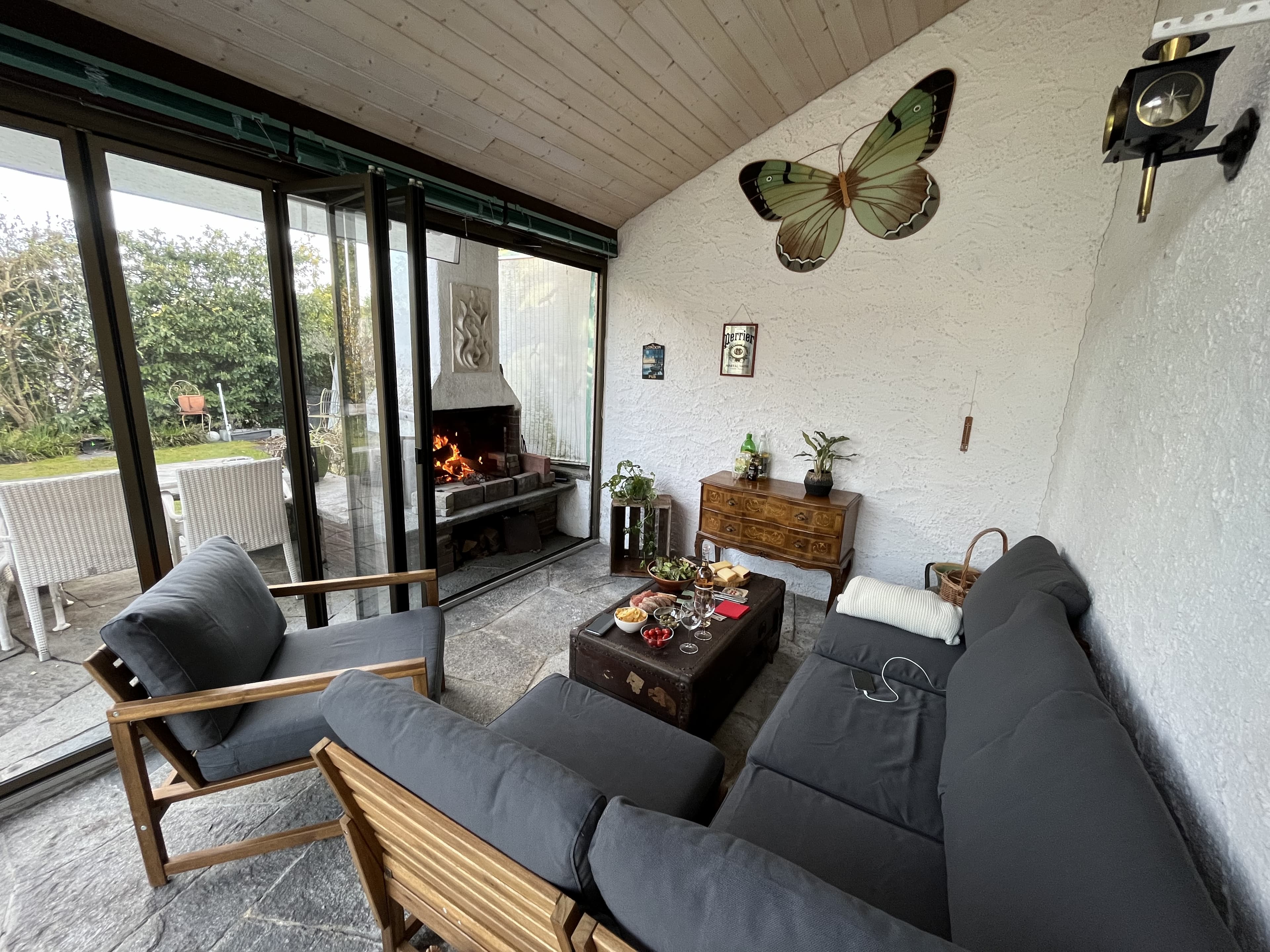- Wohnzimmer mit Cheminée, Leseecke und Wintergarten