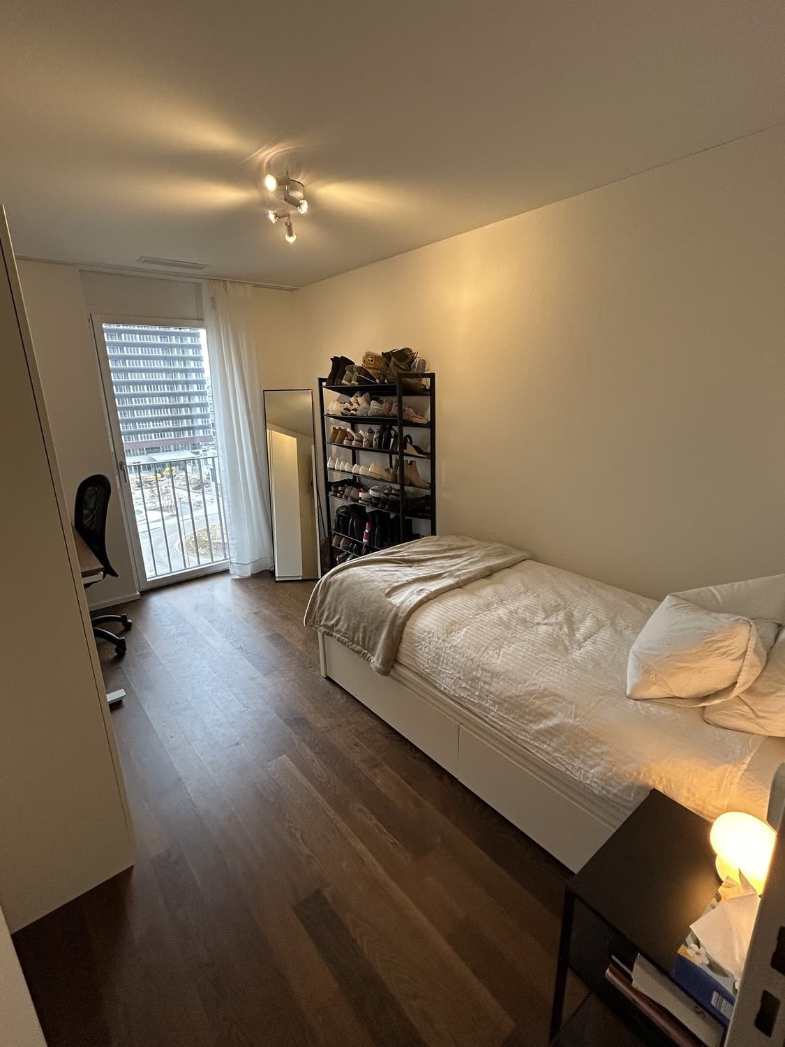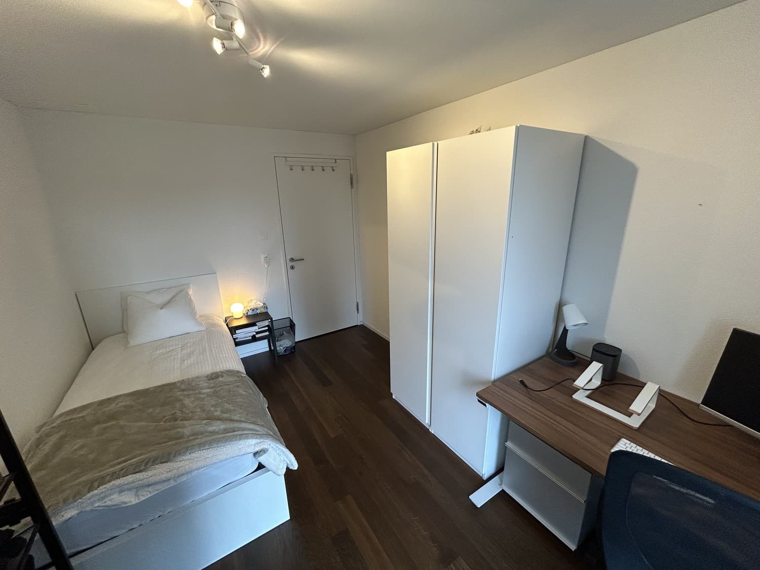 - Möbiliertes Zimmer (Kleiderschrank, Bett inkl. Duvet / Decke / Kissen, Schreibtisch / Stuhl, Monitor, Schuhgestell)