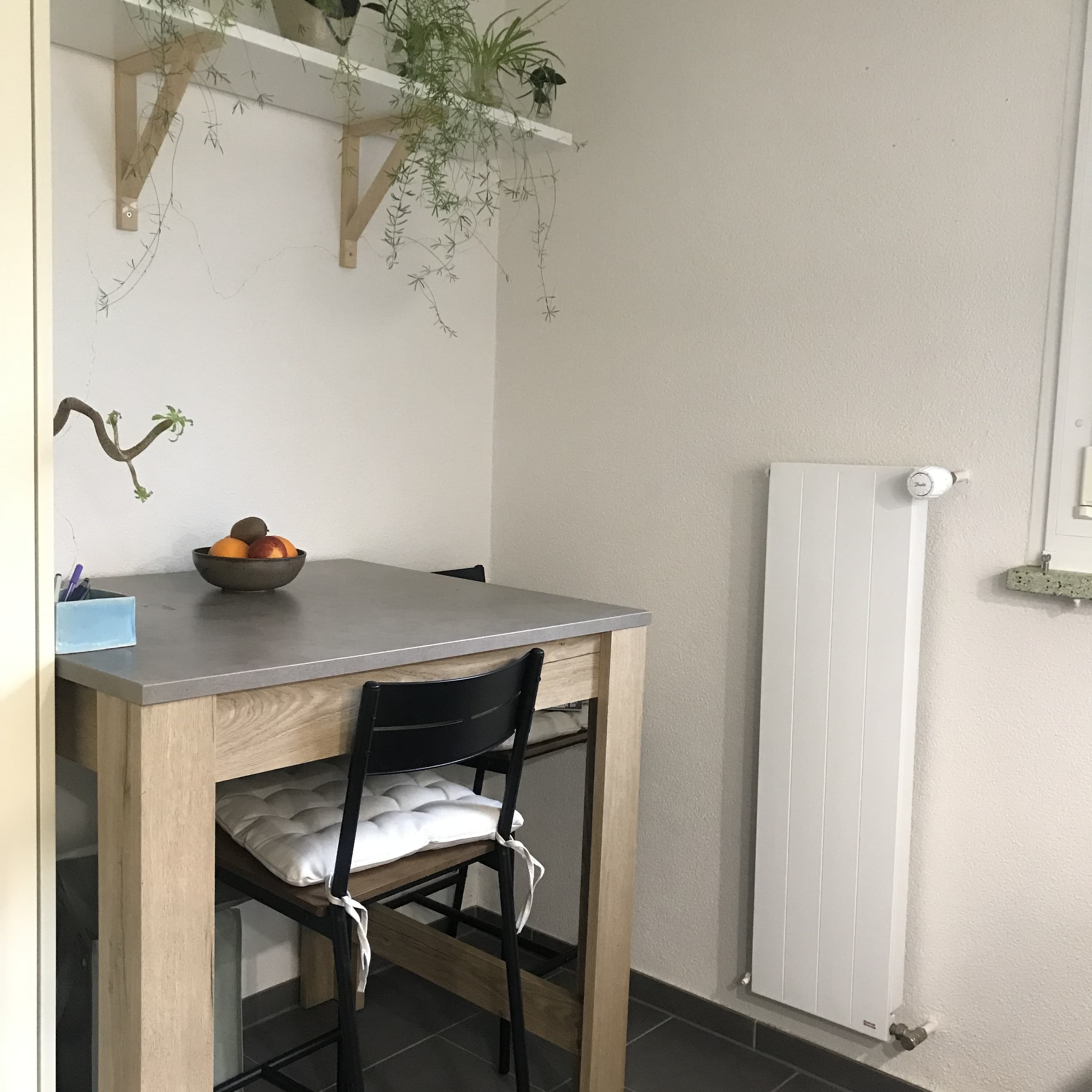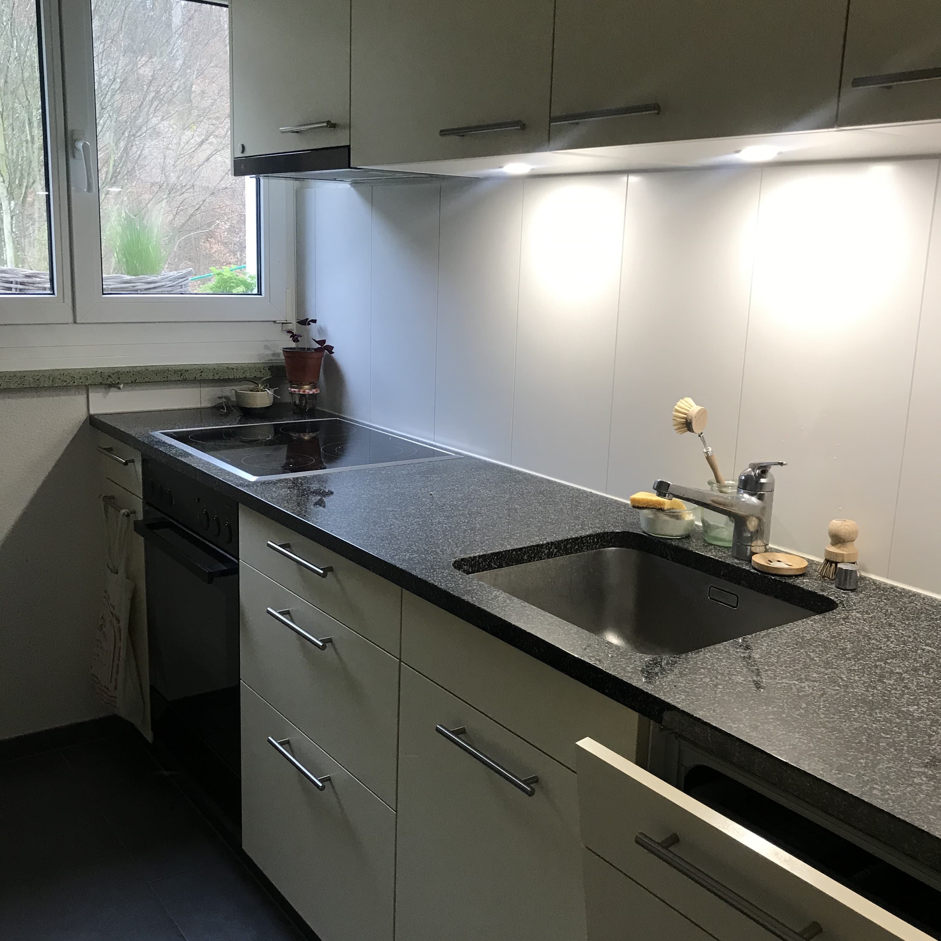 Wir teilen uns als Gemeinschaftsraum das Wohnzimmer, das sehr groß und hell ist. Die Küche ist sehr gut ausgestattet und verfügt über einen großen Kühlschrank mit Geschirrspüler und Backofen.
