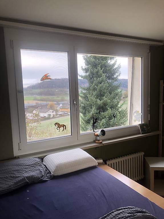 Wir haben mehrere Zimmer in unserem EFH am Hang mit guter Aussicht. Lichtdurchflutet und gross.