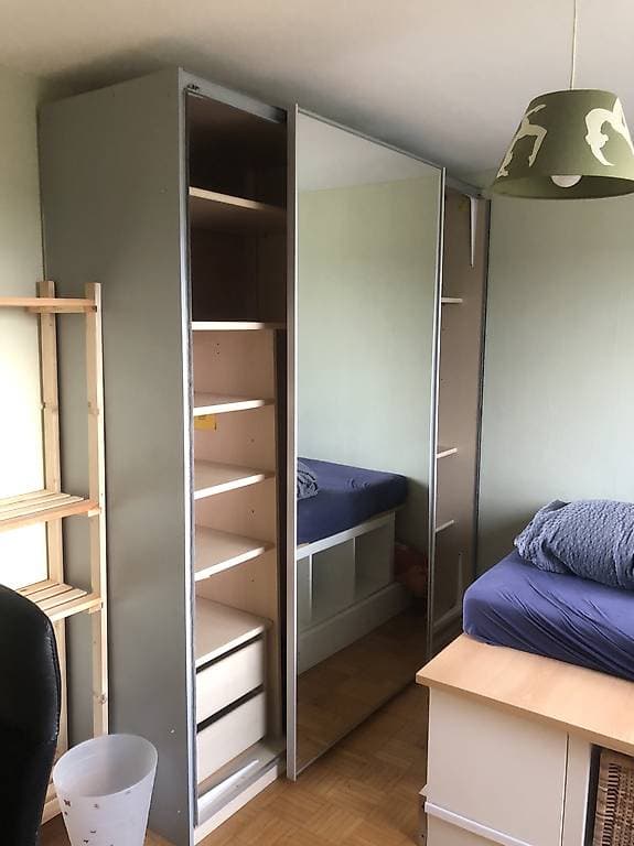 Bett mit Queensize Matratze, grosser Bürotisch und Kasten, sowie weitere Gestelle verfügbar. Die Küche wird geteilt, das Badezimmer mit maximal 2 anderen Mitstudenten. Waschmaschine & Tumbler zur freien Benützung.