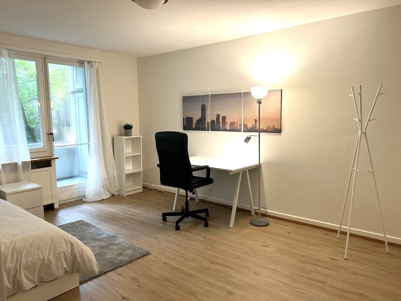 The room is bright and newly renovated, with direct access to the balcony and a view of the garden.