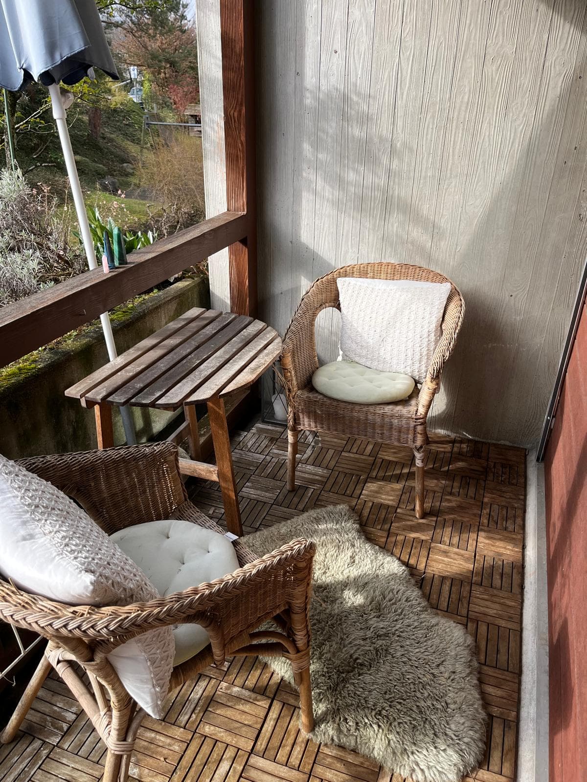Ich vermiete ein helles, vollständig möbliertes Zimmer mit eigenem Bad (Dusche) und privatem Balkon.