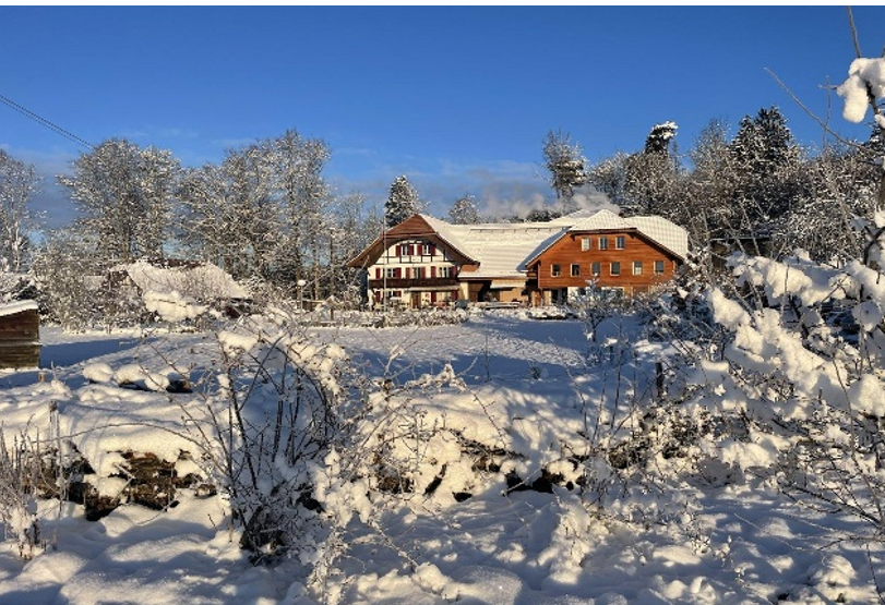 Wir sind eine WG innerhalb einer Wohnbaugenoss*innenschaft. Insgesamt leben hier 18 Erwachsene und 11 Kinder in verschiedenen Wohnformen. Als Geno teilen wir einen riesigen Umschwung, Garten, Sauna (ya ! Perfekt für den Winter), Pool (eher im Sommer…), Werkstatt, grosse Gemeinschaftsküche und einiges mehr.