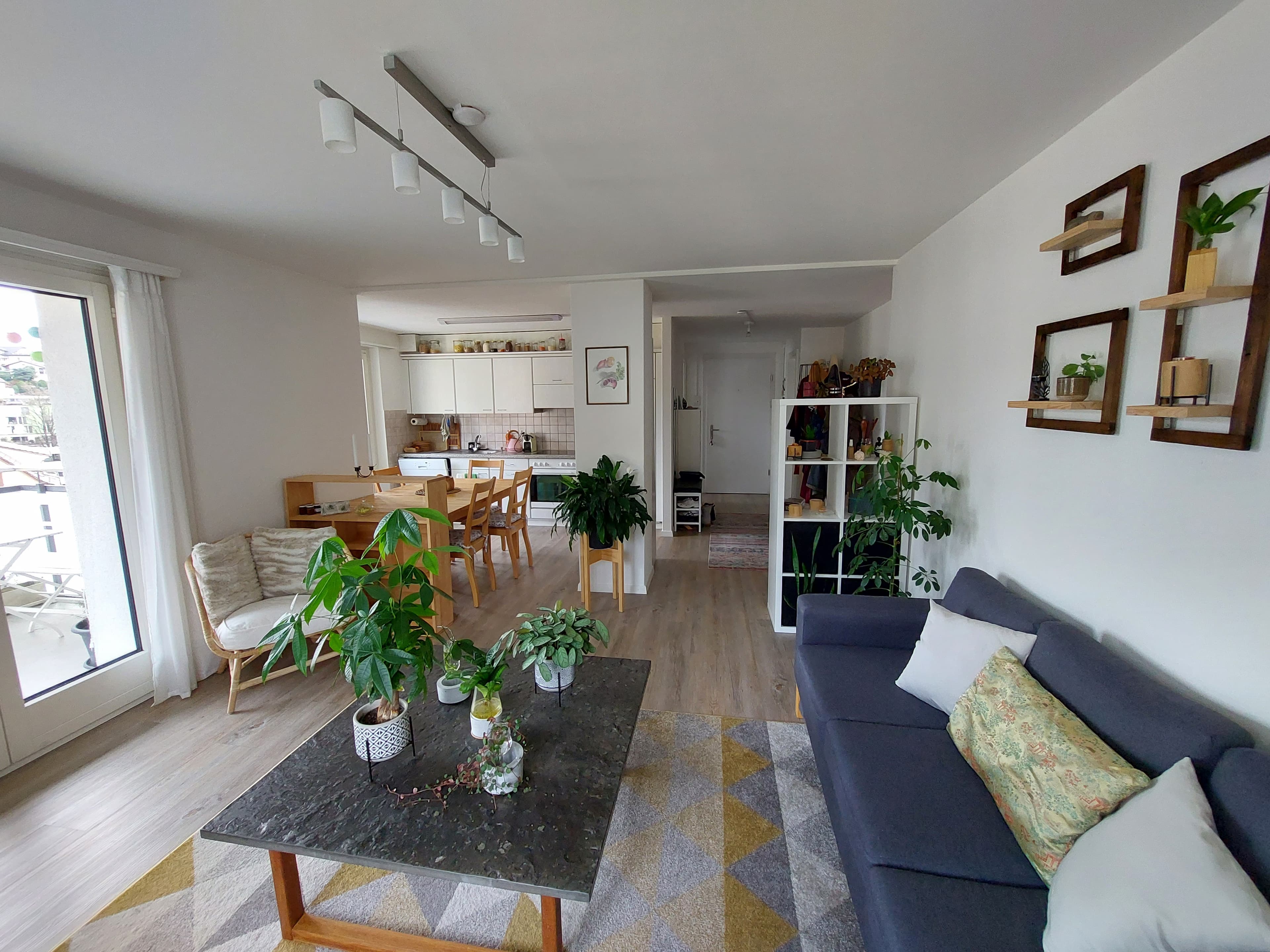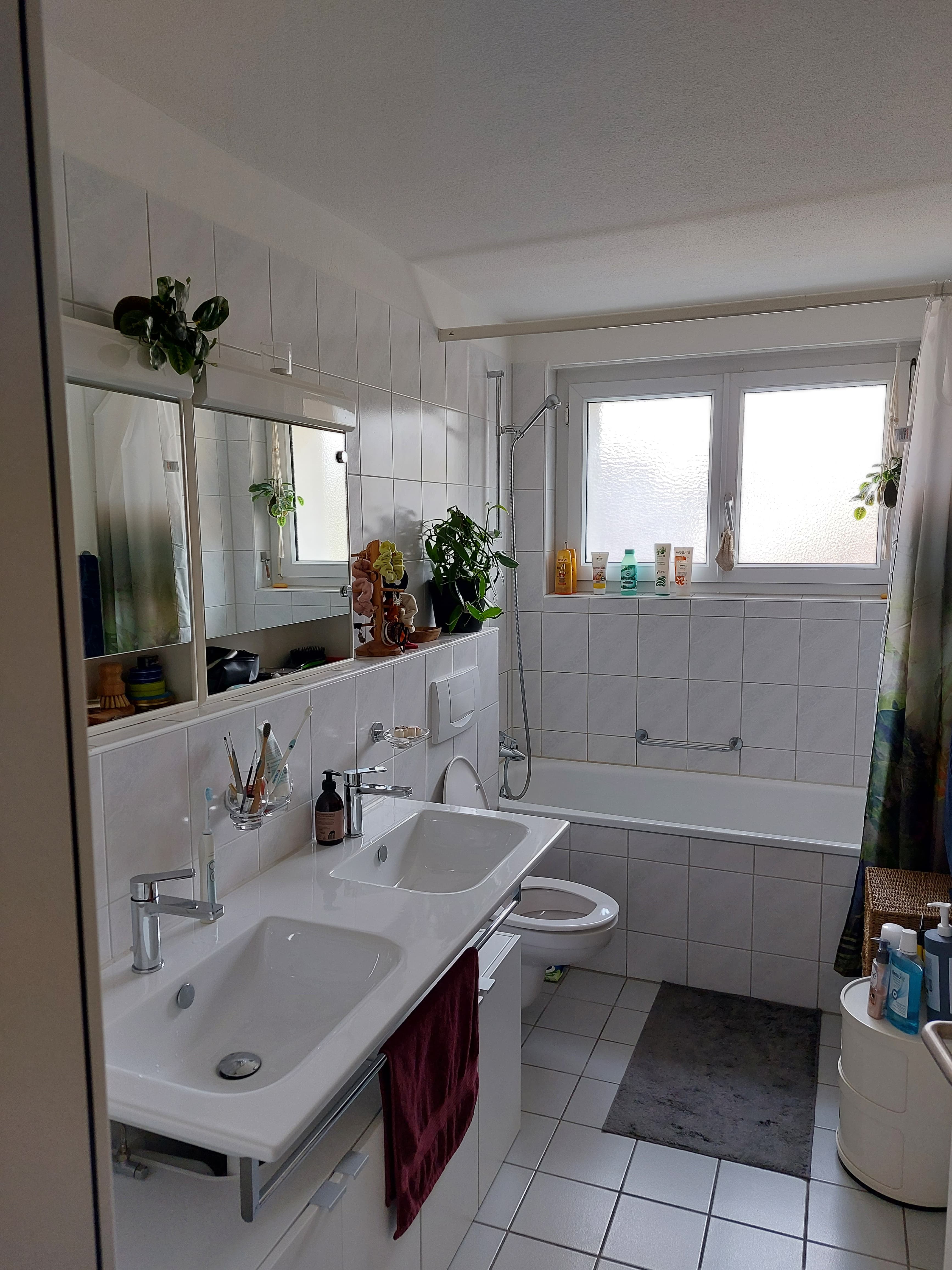 Die Küche (neu saniert im Feb. 2025), der Essbereich, das Wohnzimmer und der Eingangsbereich sind offen gestaltet und insgesamt ca 34 m² gross. Es gibt zwei Zugänge auf den grossen Balkon mit Weitsicht, der gegen Nordwesten ausgerichtet ist. Das Badezimmer ist eher gross mit einem Doppelwaschbecken, einem WC, einer Duschwanne und einem Fenster.