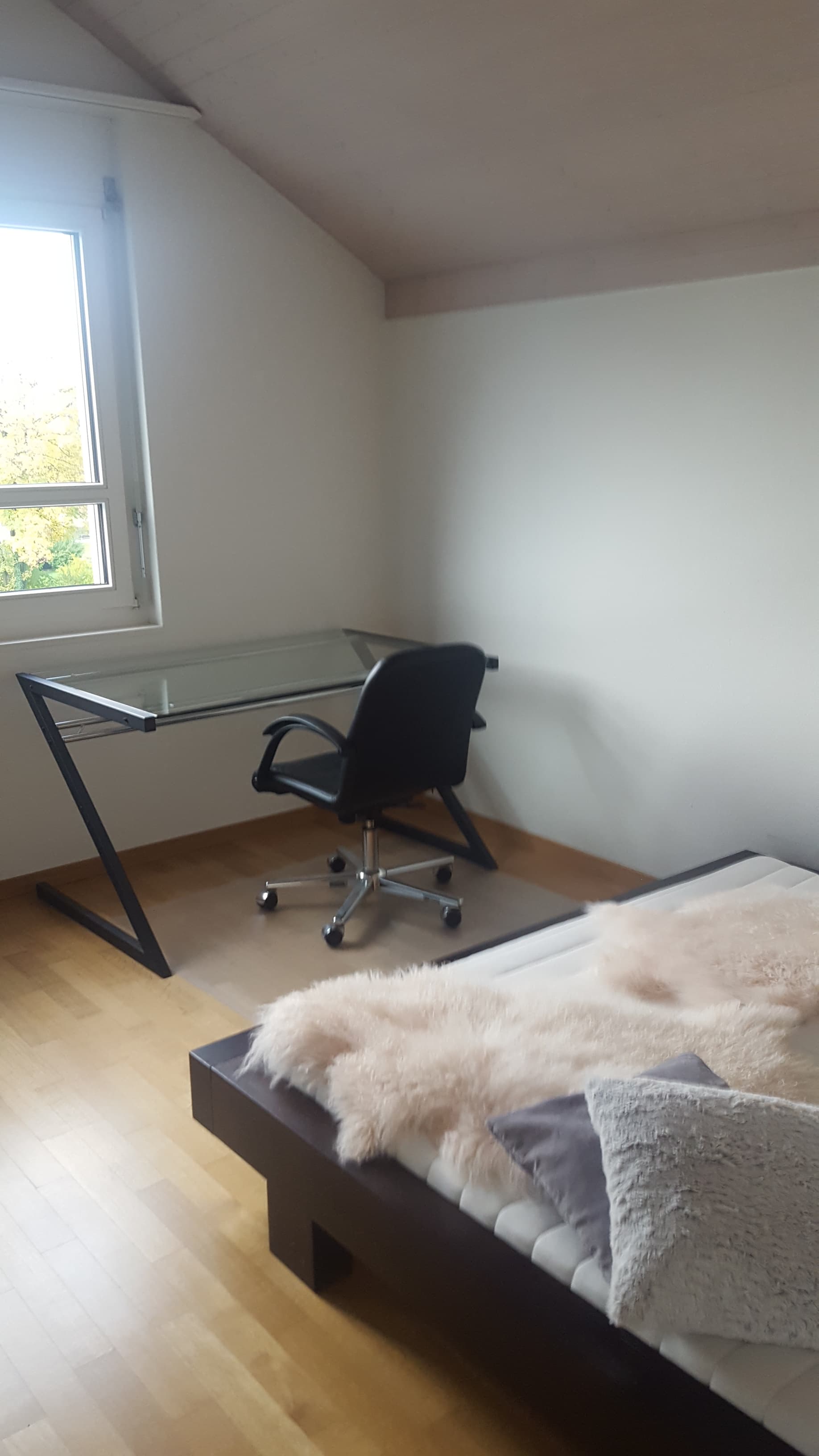 Wir sind eine Business WG, in einer schönen 5,5 Zimmer Maisonette- Wohnung, 2 Min. vom ÖV, ruhig und sonnig gelegen, alles zum Lebensunterhalt ist in 3 Min. erreichbar, wie Einkauf, Restaurants, die grossen Firmen und die Natur. Wir plaudern oder sitzen zusammen, wenn es sich ergiebt.