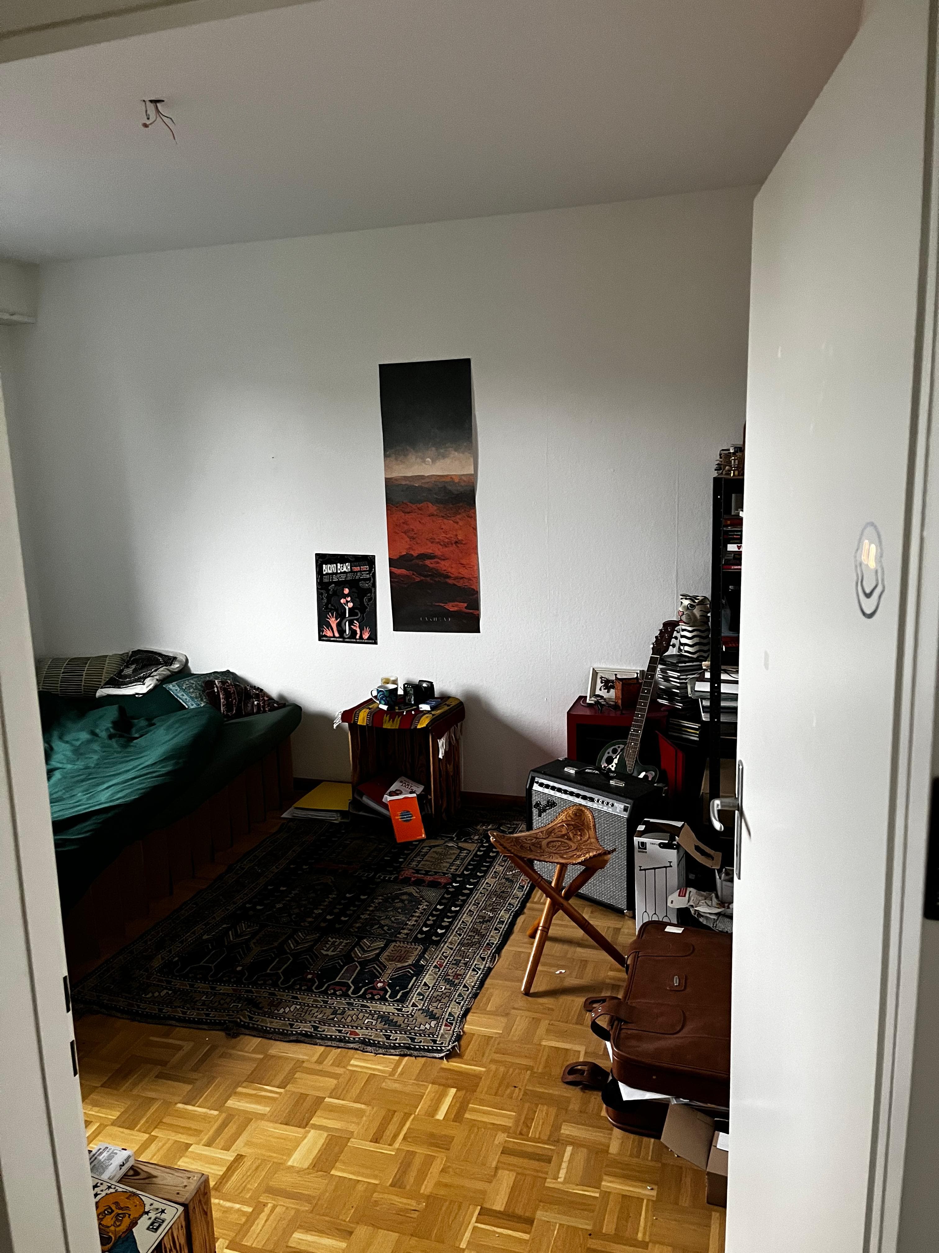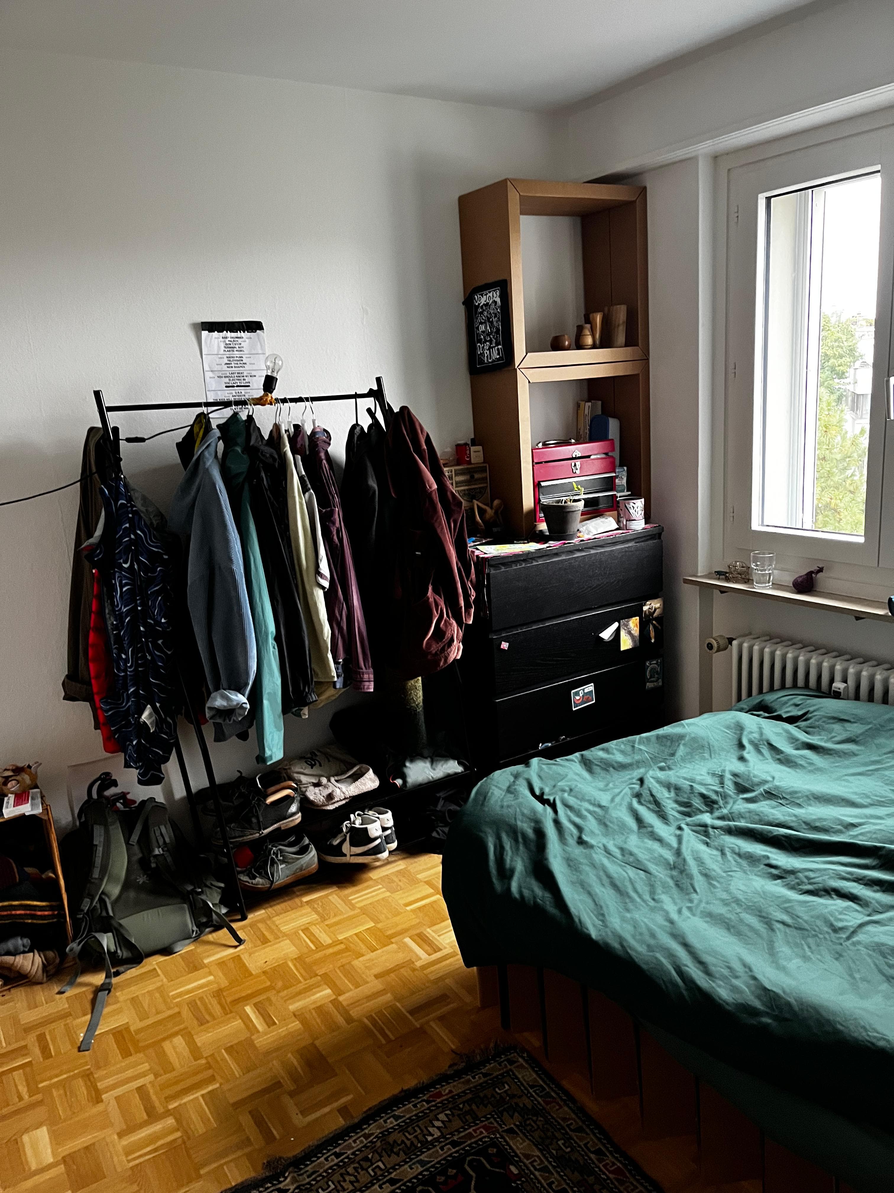 Dein zukünftiges Zimmer ist ca. 12 qm groß, hat Holzboden und ist nicht möbliert. Es hat ein großes Fenster mit Ausblick über die Altstadt bis zu den Roche-Türmen – also wirklich ein schöner, heller Raum mit tollem Ausblick.