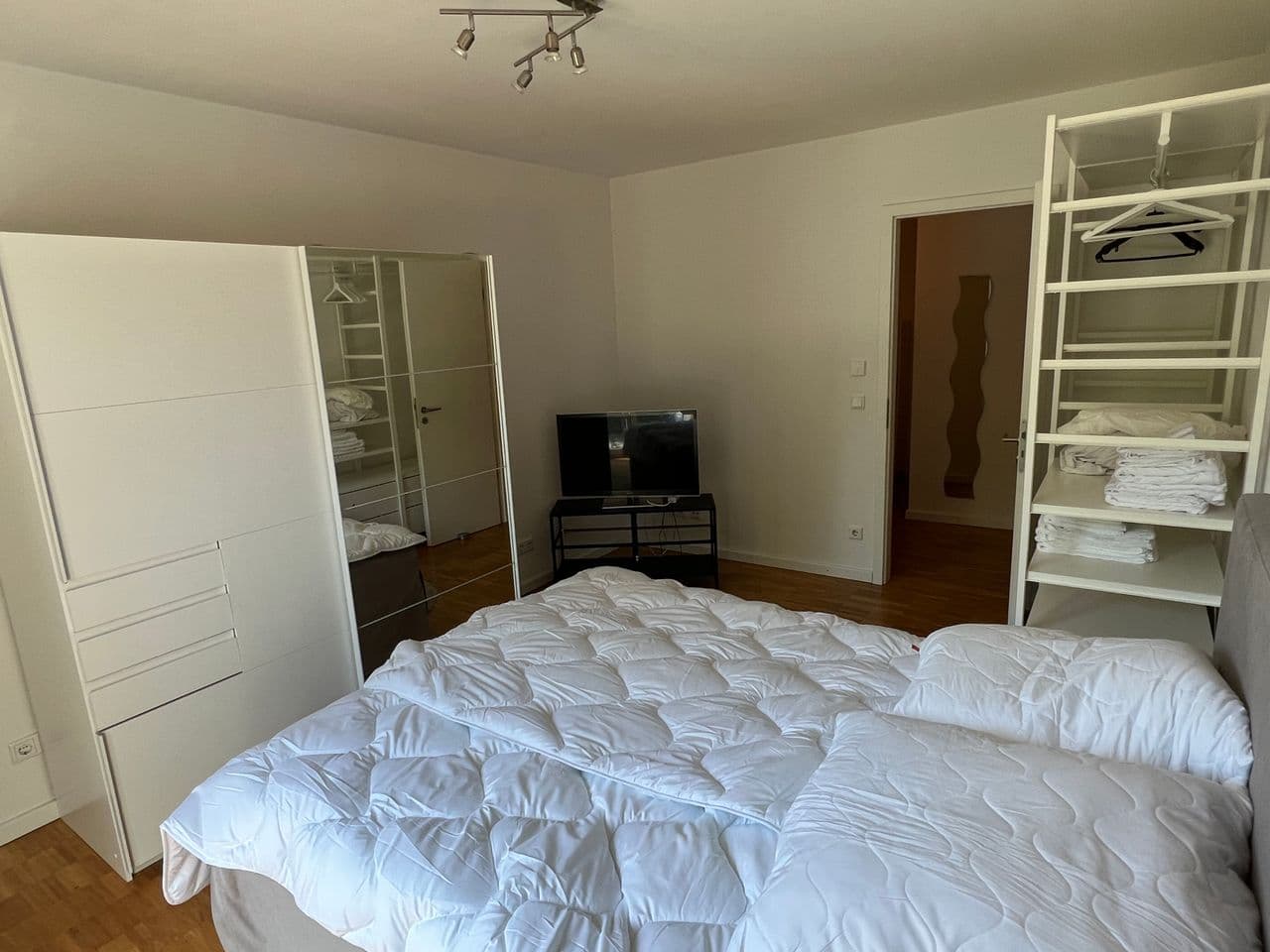 · Équipements : L'appartement est entièrement meublé (cuisine équipée, salon avec canapé et table à manger, salle de bains partagée). La chambre dispose d'un lit, d'une armoire et d'étagères.