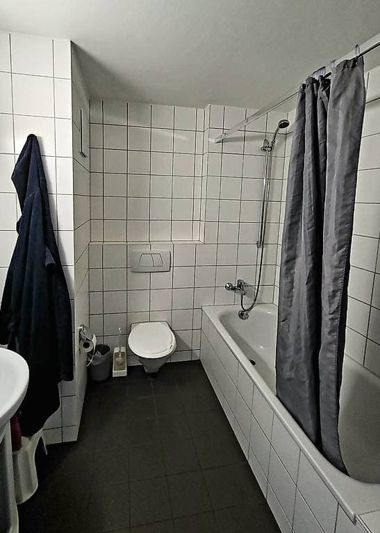 * Modernes Badezimmer: Komplett mit weissen Fliesen, Waschbecken, Spiegel und WC ausgestattet