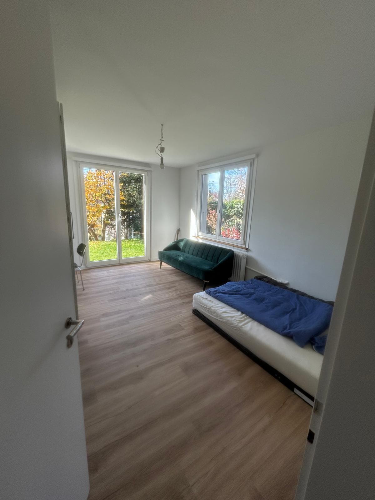 Eines der schönsten Zimmer im Haus – hell, ruhig, mit direktem Zugang in den Garten. Ein Ort zum Durchatmen, mit Abendsonne und viel Grün vor der Tür. Es wird ab März nochmals ein Gartenzimmer frei, daher kann es ab dann eine längerfristige Wohnmöglichkeit ergeben.
