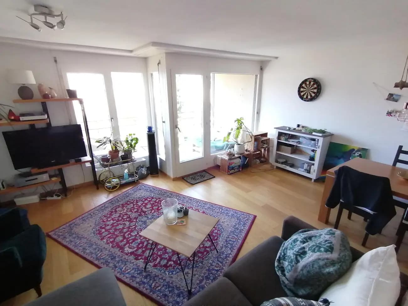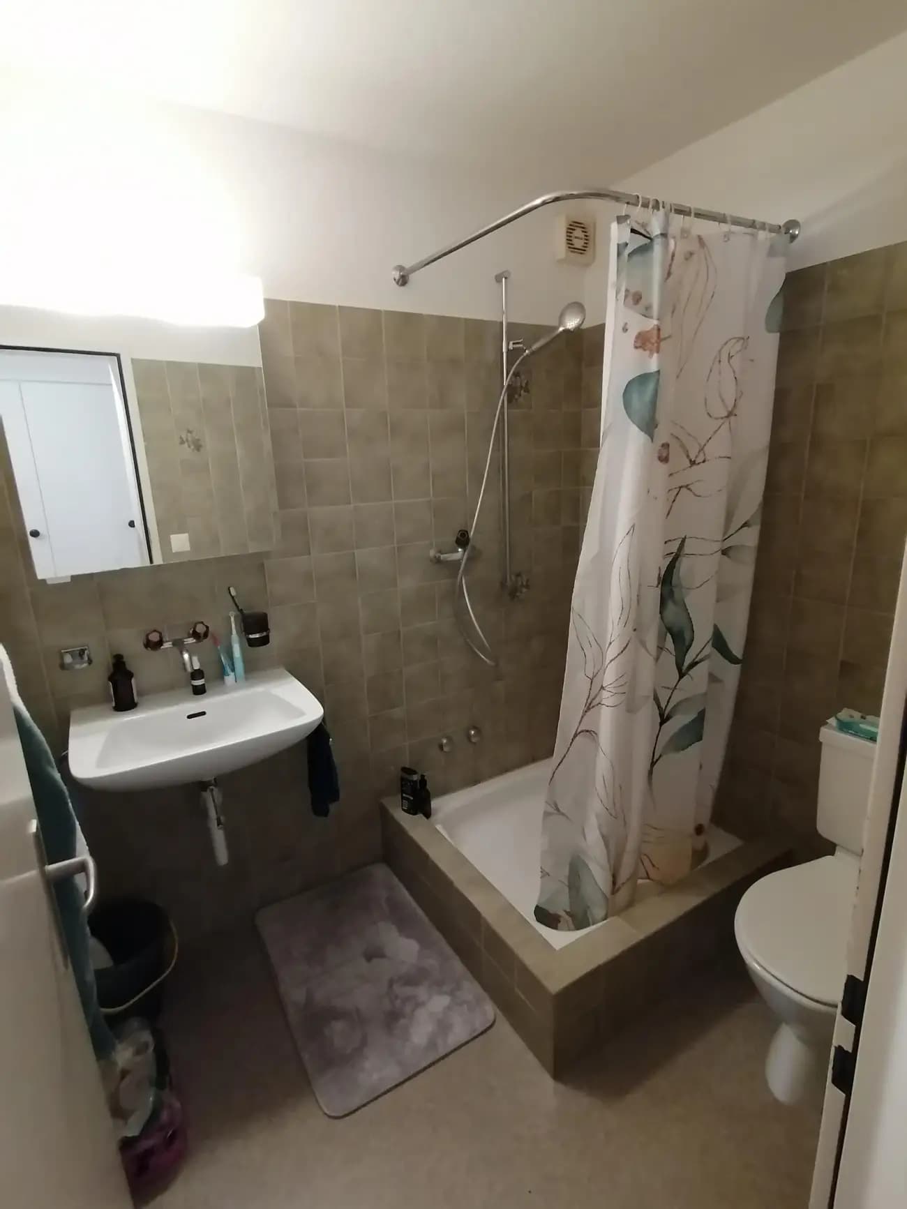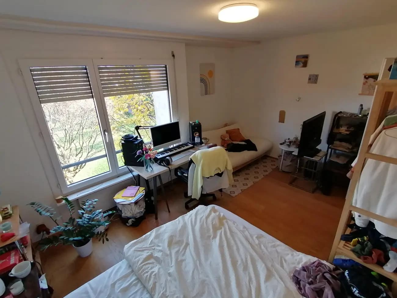 Zimmer: helles, geräumiges Zimmer (15m²) mit eigenem Bad/ Dusche. Kosten 693.- CHF im Monat (inklusive Nebenkosten& Internet).