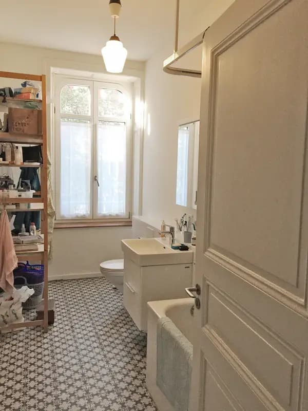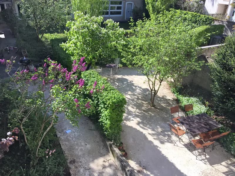 Wir haben eine grosszügige gemeinsame Wohnküche. Den grünen Hinterhof mit Sitzplatz, Beet, Kompost und Pingpongtisch nutzen wir gemeinsam mit den anderen Anwohnern des Gevierts. Es gibt Platz im Estrichabteil. Das Haus ist hellhörig.