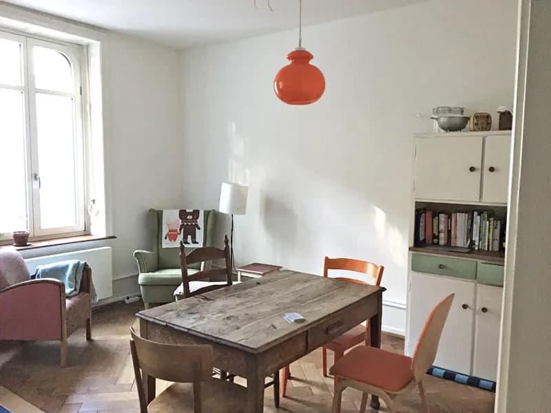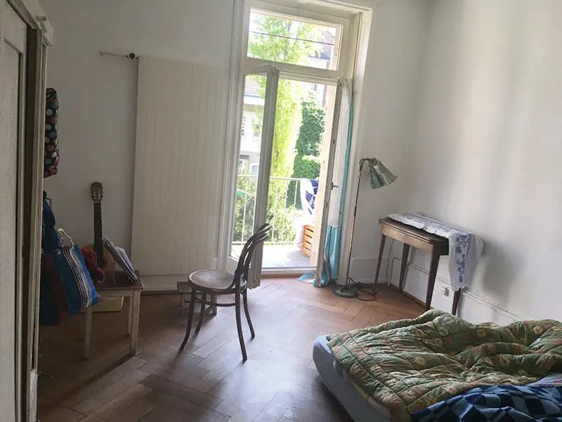 Wir wohnen im 1. Stock eines renovierten Altbaus im St. Johann an der Gasstrasse. Das Zimmer kostet CHF 797 inkl. Nebenkosten. Es hat eine Fläche von etwa 15 m2, Parkettboden und einen Balkon zum grünen Hinterhof.