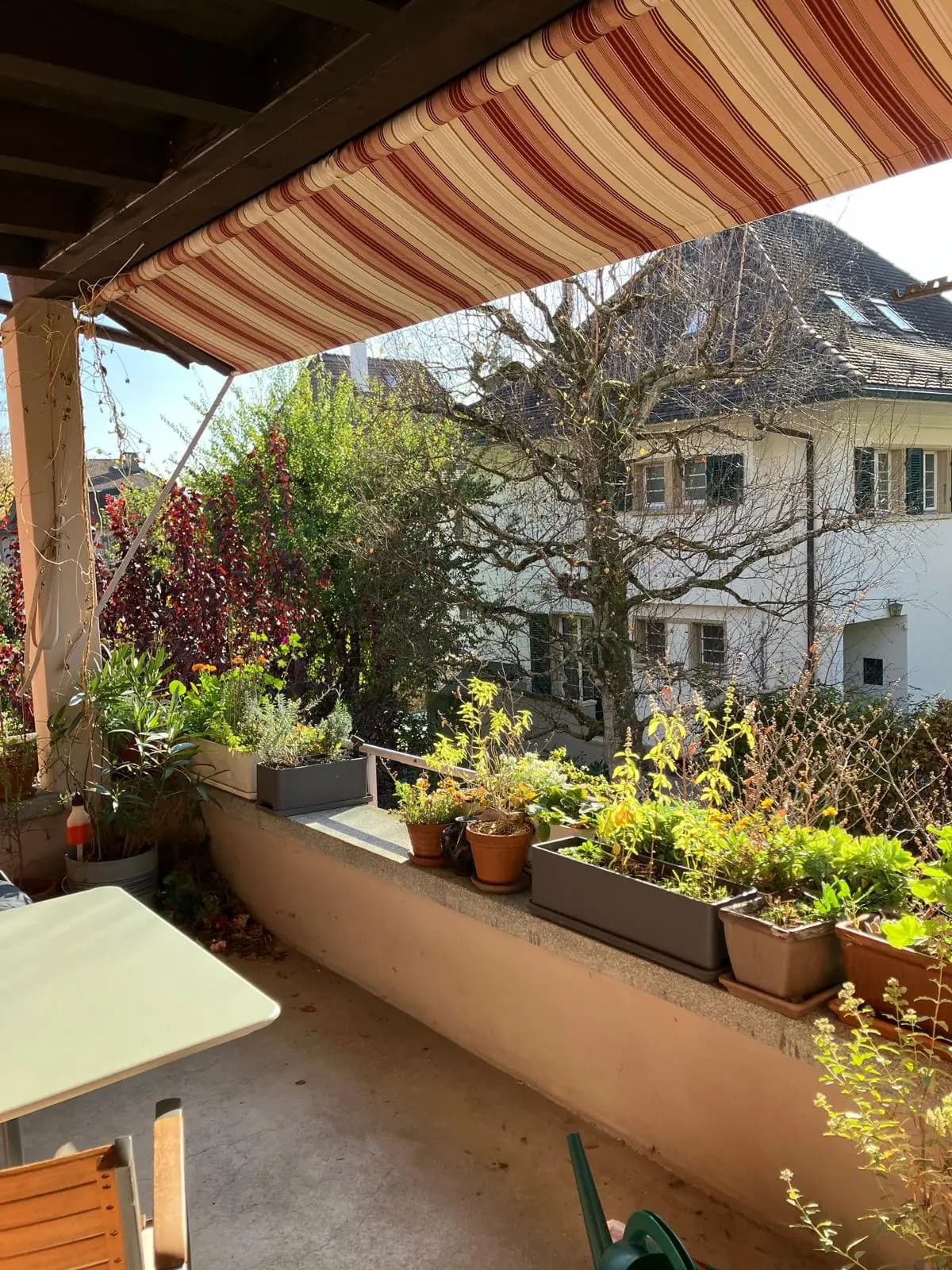 ...grosser Balkon: Biodivers und bunt bepflanzt, Tisch, Stühle, Liegestuhl, grandiose Aussicht ins Grüne und auf den Gurten
