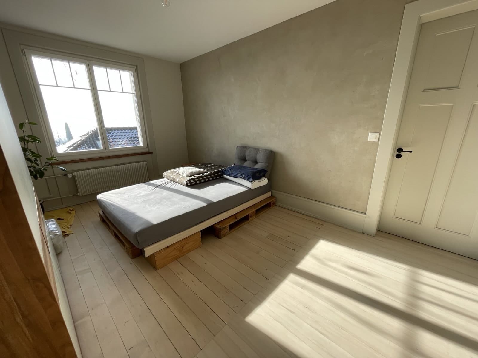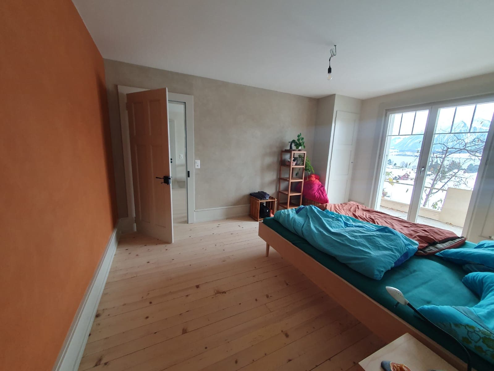 Die alte Dame ist ein WG Haus, das aus zwei separaten Wohnungen besteht: eine 5.5-Zimmer Maisonette Wohnung im Erdgeschoss und OG und eine 3.5 Zimmer Wohnung im Dachgeschoss. Das Haus ist bereits über 100-jährig und wurde die letzten 2.5 Jahre fleissig saniert. Ab März 2026 sind nun alle Stöcke einzugsbereit und zwei grosszügige Zimmer warten auf euch! Die zwei Zimmer befinden sich im Erdgeschoss mit eigenem Bad und direktem Zugang zur Terrasse und Garten. Gemeinsam bewohnen wir eine grosse Wohnküche mit Balkon. Das Haus befindet sich an wunderschöner Hanglange mit Blick auf See und Berge. Zu Fuss erreichst du innert wenigen Minuten den See, den Wald, Öv-Haltestelle und Einkaufsmöglichkeiten. Mit dem Fahrrad bist du gemütlich in 10 Minuten inmitten in der Stadt Thun und am Bahnhof.