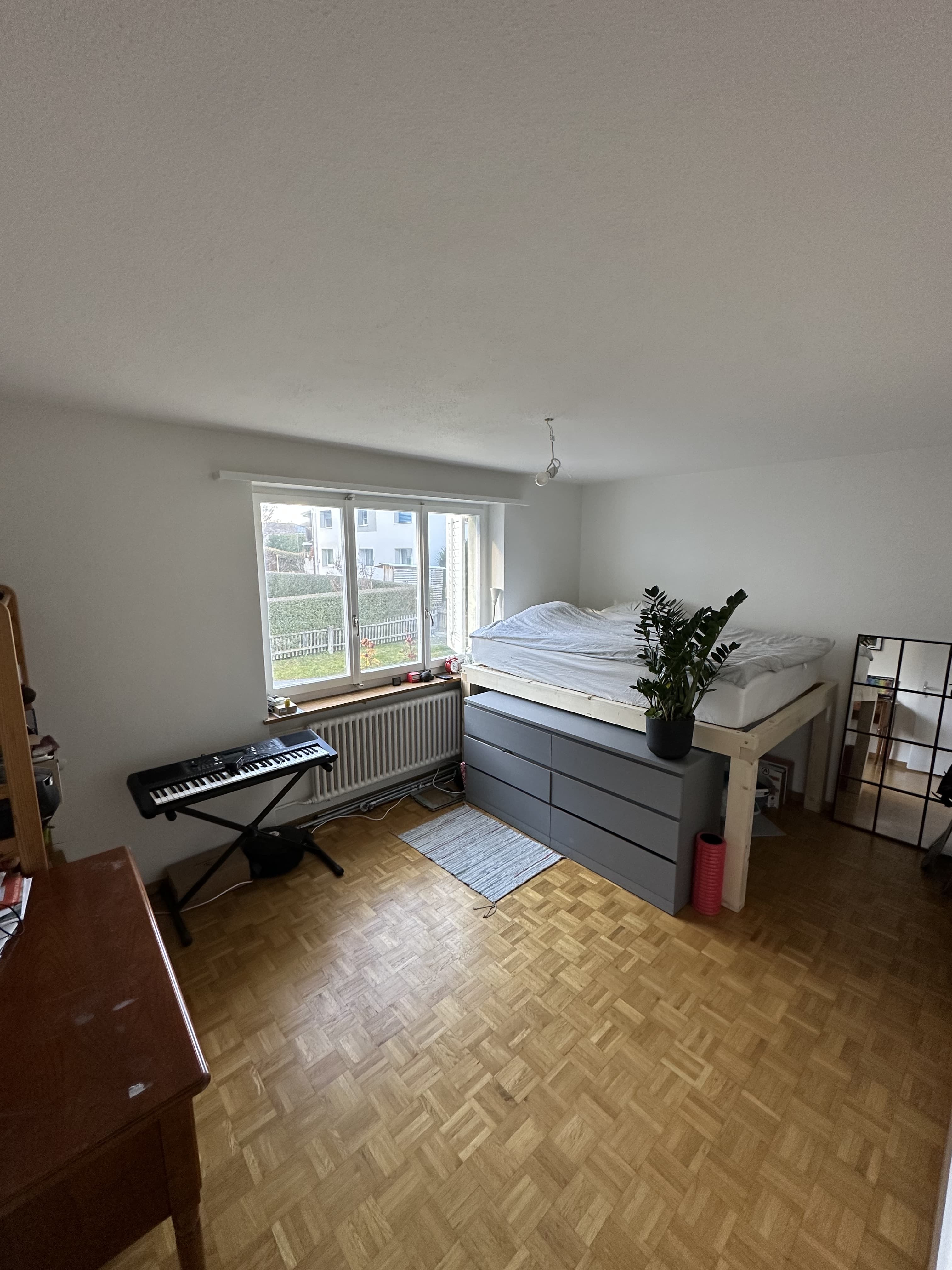Das Zimmer ist ca. 14 qm gross, hell, nicht möbiliert und mit Nachmittagssonne.