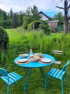 Originelles Maisonnette Studio mit wunderschöner Aussicht auf Feld und Wald: absolut naturnah und ruhig-eigene Dusche/WC vorhanden, überdeckter Parkplatz und zwei Katzen ebenfalls vorhanden-leider keine weiteren Haustiere möglich. Kochplatte und Kaffeemaschine vorhanden.