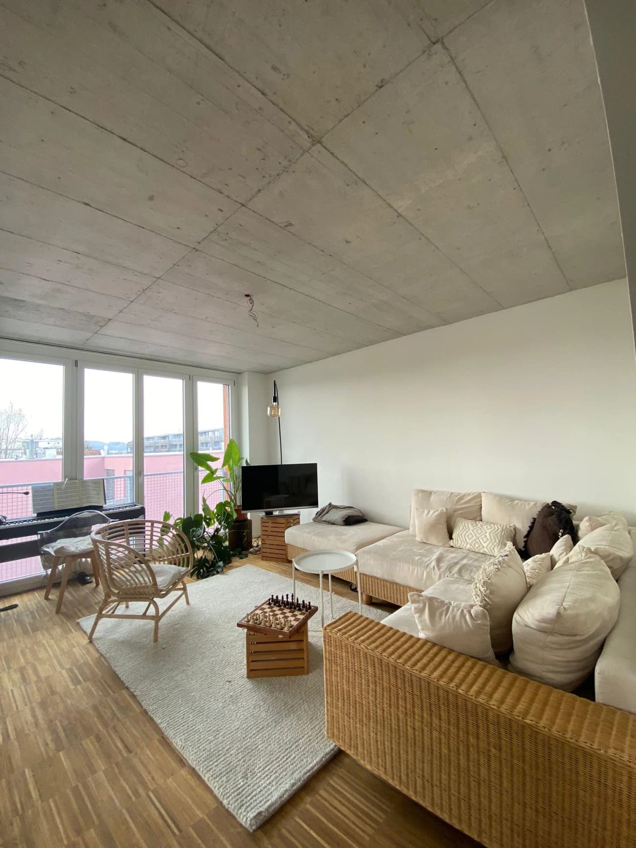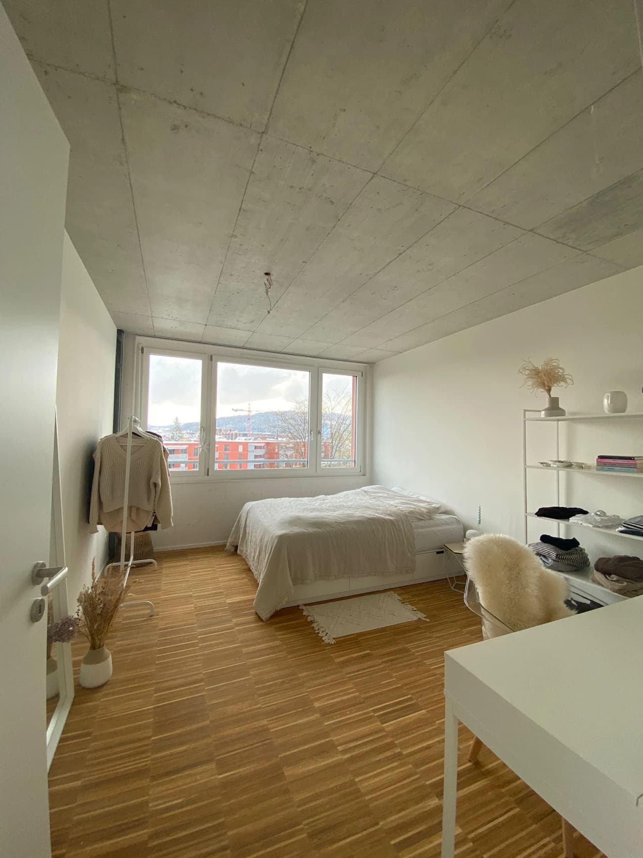 Die Wohnung liegt nur wenige Minuten zu Fuss vom Bahnhof Oberwinterthur entfernt, ideal für Pendler und Studierende. Einkaufsmöglichkeiten, Cafés und das Quartierleben sind schnell erreichbar. Gleichzeitig bist du in kürzester Zeit im Grünen. Das Zimmer ist hell und freundlich mit grossen Fenstern, die viel Tageslicht reinlassen. Es hat einen schönen Holzboden und bietet genug Platz zum Wohlfühlen und Einrichten nach eigenem Stil. Das Zimmer wird nicht möbliert vermietet und hat zirka 15m^2.In der Wohnung gibt es zwei Badezimmer, ein schönes Wohnzimmer und eine gemeinschaftliche Küche. Wir suchen aufgrund des Auszugs eines Paares zwei neue Mitbewohner:innen, die Lust auf ein angenehmes WG-Leben haben. Gemeinsames Kaffeetrinken oder auch mal zusammen Abendessen/Sport machen soll genauso Platz haben wie Privatsphäre und Rückzug. Wichtig ist uns ein respektvolles, unkompliziertes Miteinander. Am besten passt es, wenn du ungefähr zwischen 20 und 35 bist. Wir sind eine umgängliche, offene und herzliche WG (26, 27 und 29 Jahre alt), die gerne draussen unterwegs sind, ob Wandern, Joggen oder Fahrrad fahren. Uns ist ein freundliches und entspanntes Zusammenleben wichtig, deshalb sind wir keine Zweck-WG, sondern schätzen den Austausch und ein gutes Miteinander. Zusätzlich bietet unsere Genossenschaft viele tolle Extras wie einen Fitnessraum, eine Sauna, eine Werkstatt und einen Gemeinschaftsraum, die du natürlich ebenfalls mitnutzen kannst!