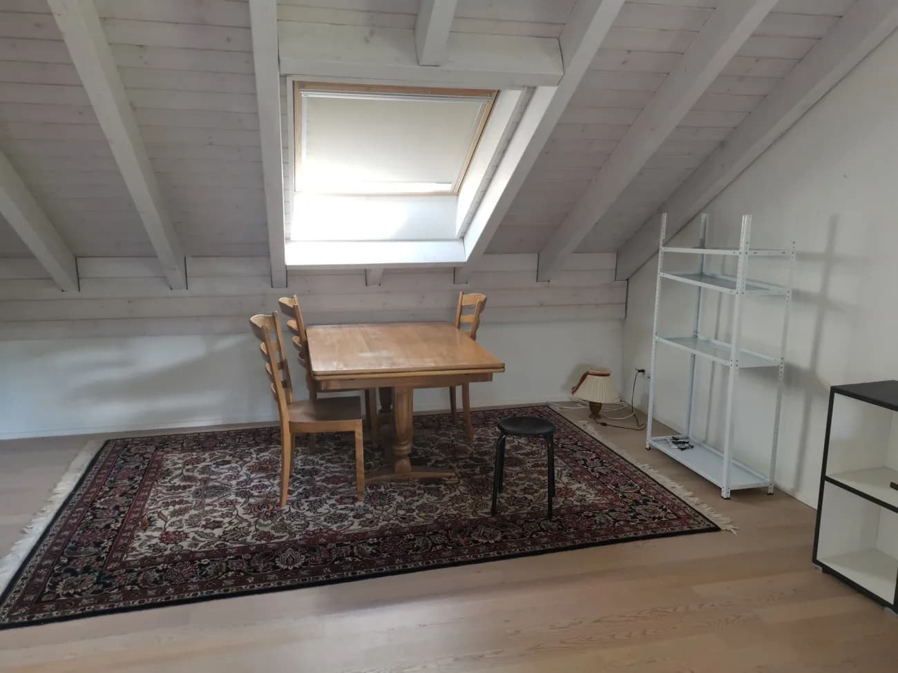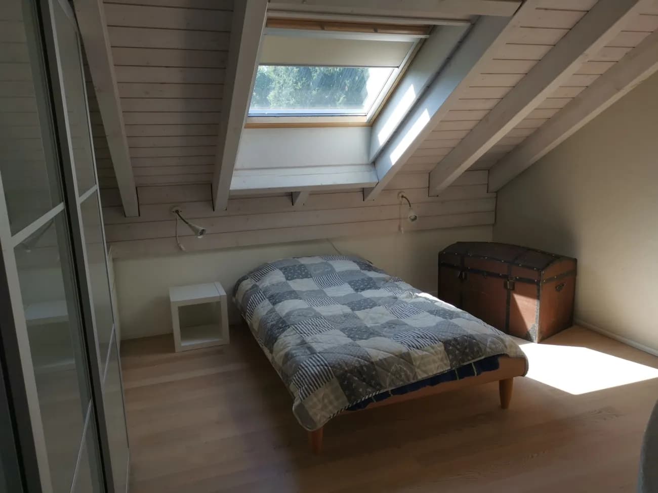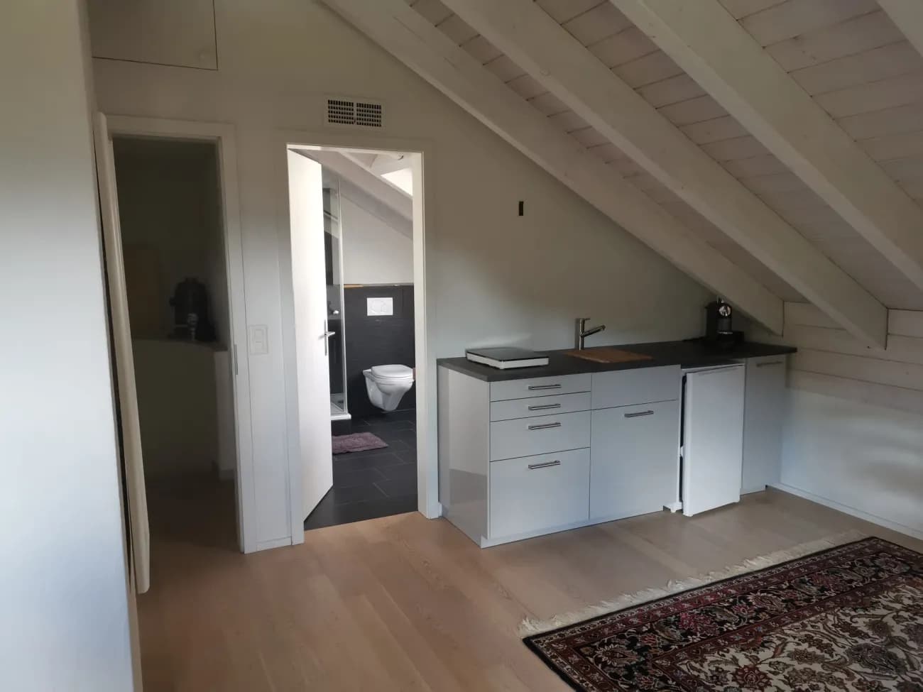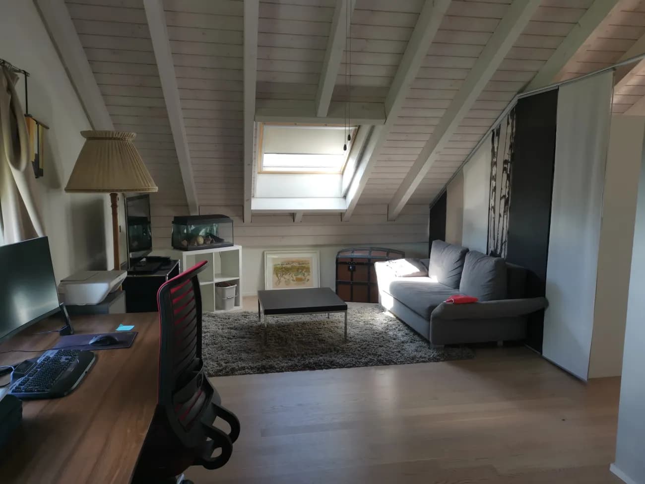 Das Zimmer erstreckt sich über den gesamten zweiten Stock. Es hat ein eigenes Badezimmer mit Dusche. Mit über 40m2 bietet es ausreichend Platz für all das, was man in den eigenen 4-Wänden braucht. Es ist problemlos möglich, ein Bett, eine Fernsehecke, einen Bürotisch und einen Esstisch hineinzustellen, ohne dass der Raum dadurch vollgestellt wirkt, siehe Fotos.