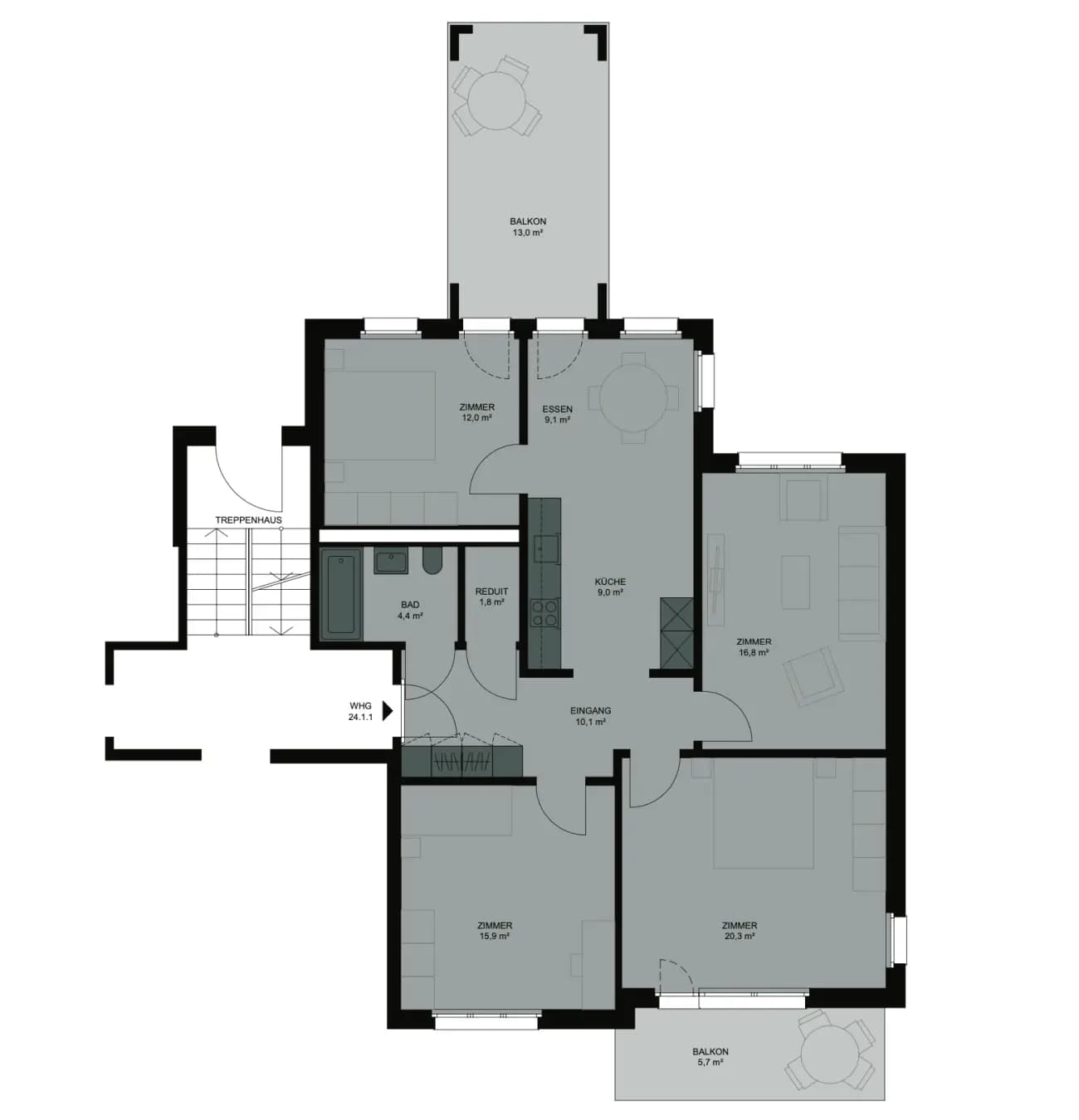 Die Wohnung ist weniger als eine Minute von der Bus- und Tramhaltestelle Loryplatz entfernt und liegt im ersten Stock. Für Velos gibt es einen grossen bedeckten Unterstand. Die zwei Balkone bieten Abend- und Morgensonne und sehr viel Platz für Pflanzen! In der geräumigen Küche hat gut ein grosser Tisch Platz.