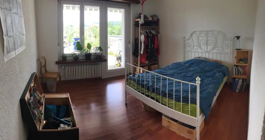 Dein künftiges Zimmer ist ruhig, 13.4m2 gross mit Terrassenzugang. Das Bad wird zu 3. geteilt und ist direkt nebenan. In den Nebenkosten (ca. 150 CHF) sind die Putzfrau, Hausrats-Versicherung, Internet, ein ZeitungsAbo, Heizung/Wasser und Serafe enthalten. Also ein Rundumpaket :-) (Miete max. 850.- inkl. Nebenkosten)