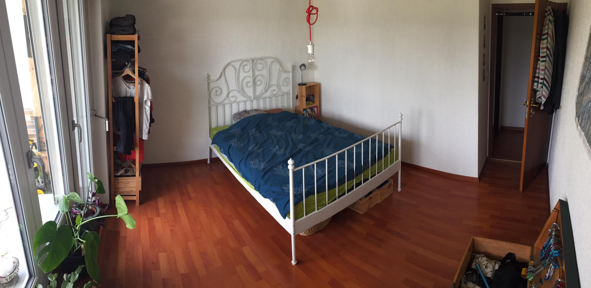 Dein künftiges Zimmer ist ruhig, 13.4m2 gross mit Terrassenzugang. Das Bad wird zu 3. geteilt und ist direkt nebenan. In den Nebenkosten (ca. 150 CHF) sind die Putzfrau, Hausrats-Versicherung, Internet, ein ZeitungsAbo, Heizung/Wasser und Serafe enthalten. Also ein Rundumpaket :-) (Miete max. 850.- inkl. Nebenkosten)