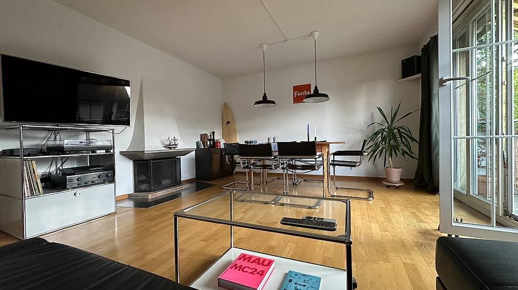 * Wohnzimmer mit Esstisch und TV (Salt Home Abo mit Apple TV)