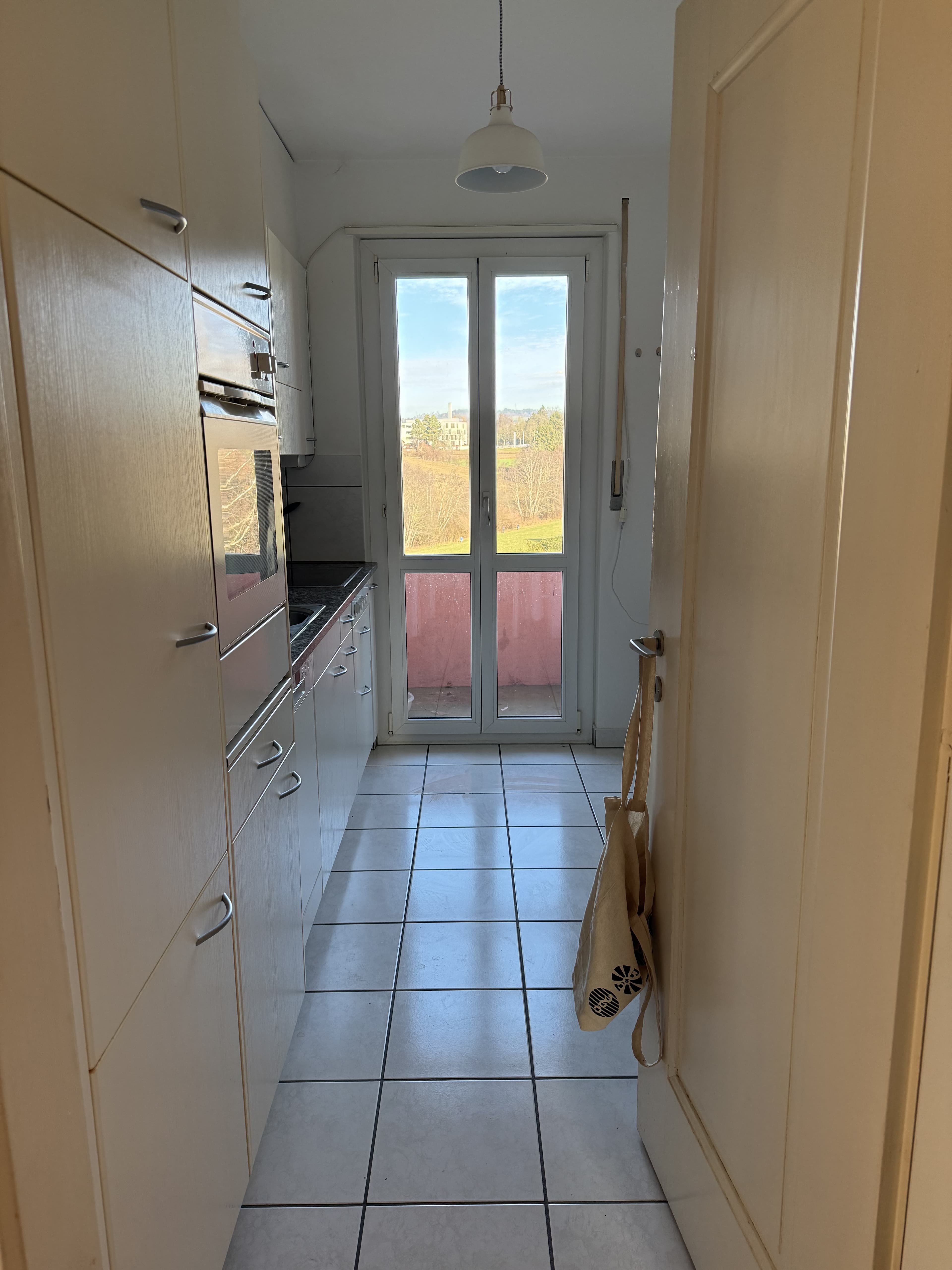 Die Küche ist grosszügig geschnitten und gut ausgestattet, mit einem grossen Kühlschrank inklusive mehrerer Gefrierfächer, einem Geschirrspüler und einem Backofen. Also im Grunde hat man alles, was man braucht. Ein kleiner zusätzlicher Balkon wird für Karton- und Biomüll genutzt.