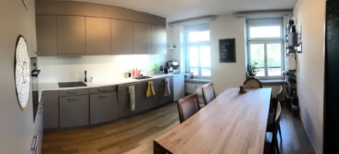 19 Quadratmeter gross, hell und hat einen Parkettboden. Die Wohnung ist gross, hat zwei Bäder, ein grosses Wohnzimmer mit Balkon und eine grosse moderne Küche. Wir sind ausgestattet mit einer Spülmaschine, einem eigenen Waschturm und etwas Platz im Estrichabteil.