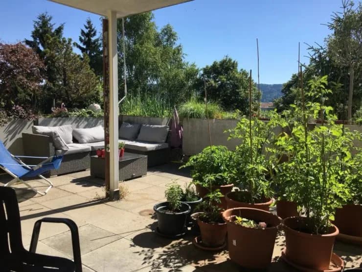 • Wir, Marko (33) und Kathleen (41) (kein Paar), sind berufstätig, mögen es zusammen zu sitzen und gemeinsam zu essen, sich über den Tag auszutauschen und auch mal etwas zusammen zu unternehmen. Wir haben eine Dachterrasse, auf der wir im Sommer Tomaten, Kräuter und anderes Gemüse auf der Terrasse anbauen. Wenn die Sonne scheint, gehen wir gern wandern oder am nahe gelegenen Katzensee baden.