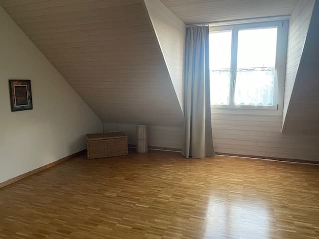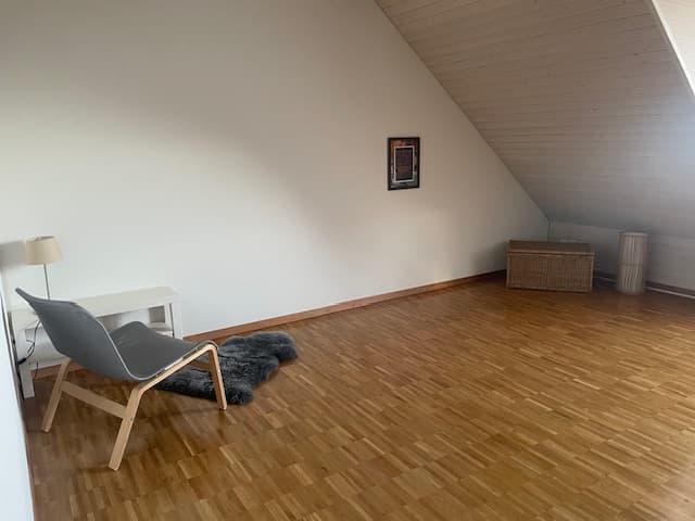 Wir vermieten in unserem Reihenhaus das Dachzimmer mit eigener Dusche/WC an Wochenaufenthalter/in, Student/in o.ä. Möblierung nach Absprache. Mitbenutzung von Küche und Esszimmer, Sitzplatz etc. Ländlich und ruhig gelegen in Iberg, mit ÖV gut erreichbar, 20-30 min vom Hauptbahnhof Winterthur entfernt. Per Fahrrad 15-20 Minuten.