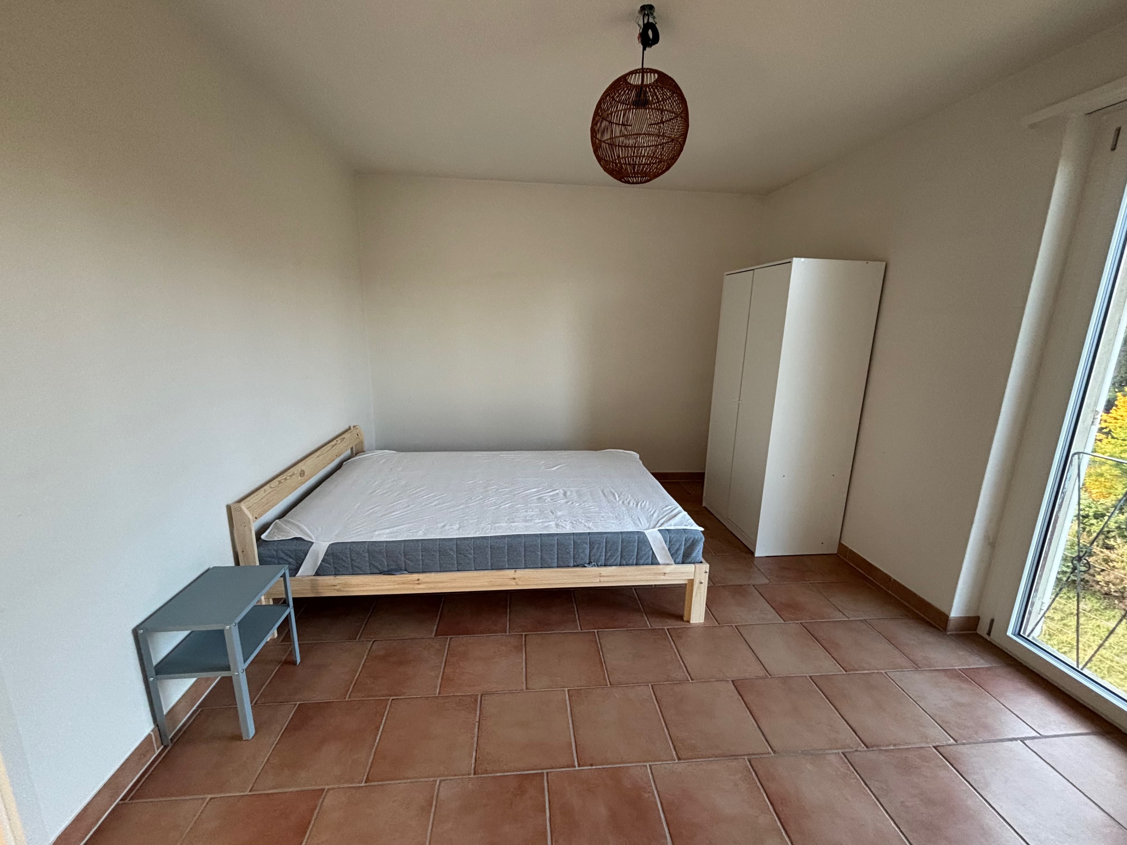 Quiet, comfy room in a 3-room flat; fully furnished with a new double bed & mattress, wardrobe, study desk, chair, and bedside table.