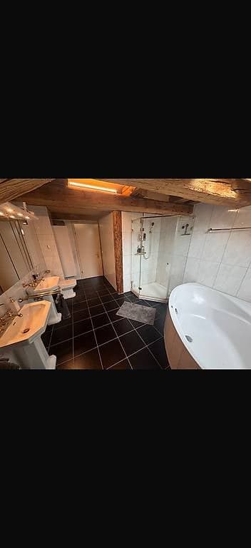 1. Stock: Zwei Schlafzimmer, ein kleines Wohnzimmer und ein grosses Badezimmer mit Badewanne, Dusche und WC.