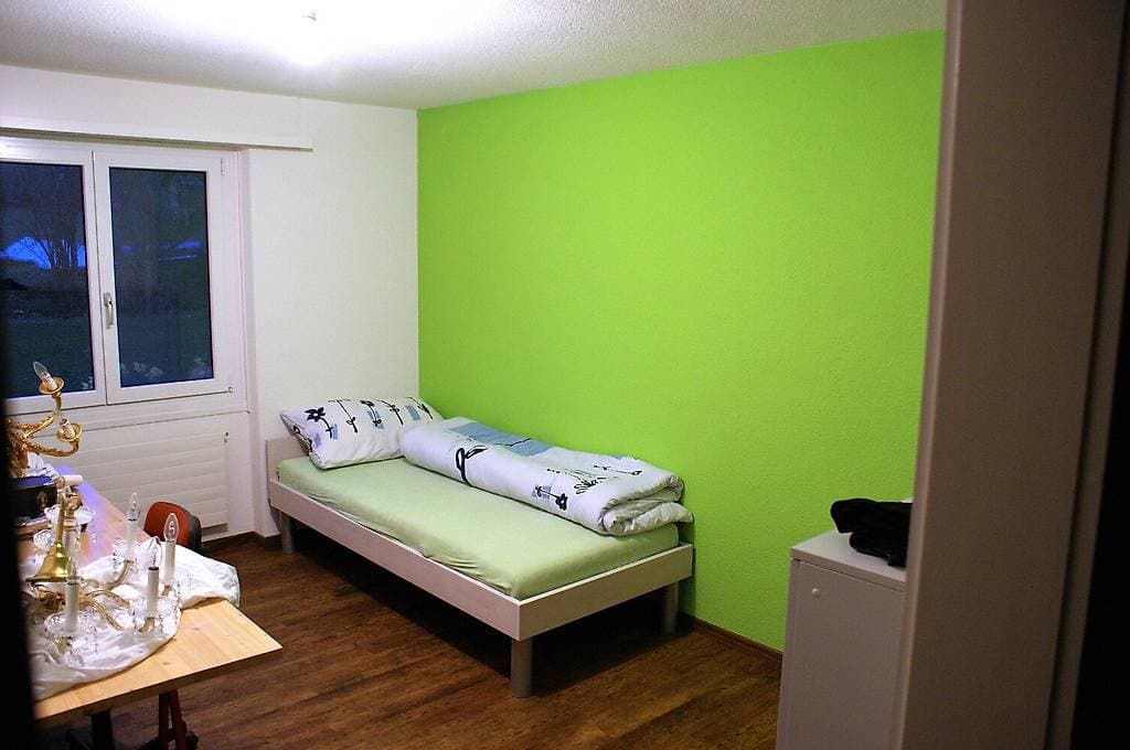 Das Zimmer ist 12 m² gross. Das Haus steht auf einem grosszügigen Grundstück mit schönem Garten. Es verfügt über mehrere Bäder, ein Wohnzimmer mit Cheminée, eine TV-Ecke in der Galerie sowie eine moderne Küche mit zwei großen Kühlschränken. Die Nebenkosten sind pauschal und beinhalten Heizung, Strom, Wasser sowie Kabelinternet (kein WLAN).