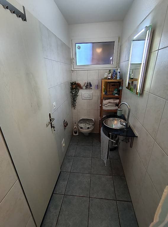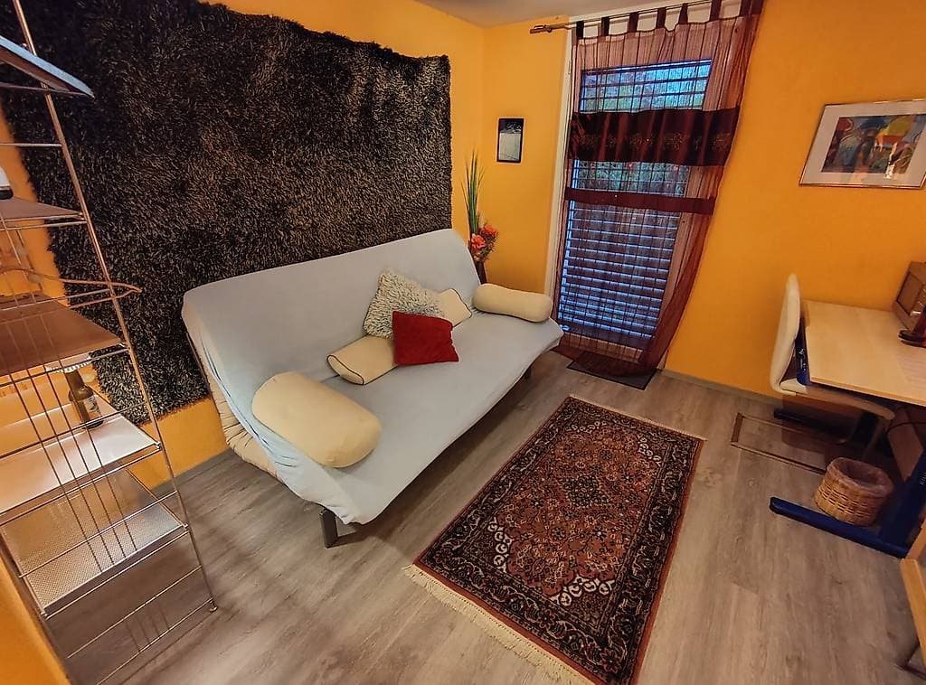 Mikrowelle und Kaffeemaschine sind ebenfalls vorhanden. WLAN und elektrische Außenjalousien. Zugang zum Gartenteil. Zwischen Zimmer und Bad/WC liegt der gemeinsam genutzte Flur/Hauseingang. Ideal für Studierende oder Praktikum/ . Auch als Büro oder Lager nutzbar. Eigene Möblierung möglich. Carport-Parkplatz kann zusätzlich gemietet werden (75CHF/Monat)