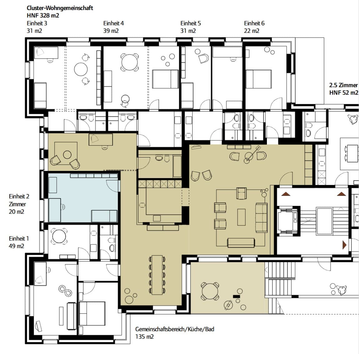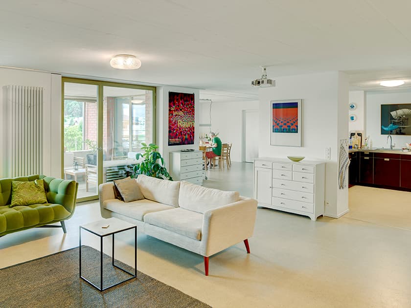 Wir teilen 135 m2 Gemeinschaftsfläche mit offener Küche und grosszügigem Wohn-/Essraum. Wir