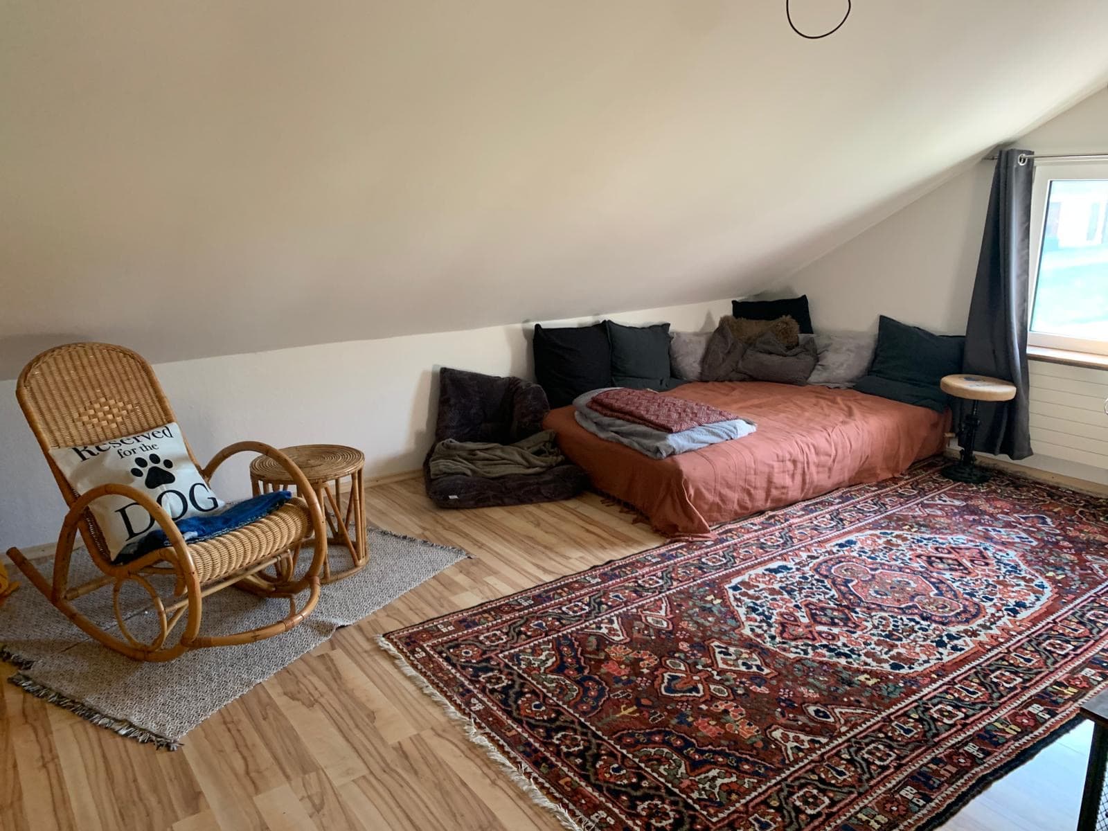Wir sind 3 Frauen und ein Mann mit einer Katze und zwei Hunden, die ca.50% der Zeit bei uns sind. Das Haus hat 7.5 Zimmer und ist oberhalb von Winterthur Wülflingen. Die Autobahn ist in 3 Minuten erreichbar und eine Postautohaltestelle befindet sich 15Minuten zu Fuss entfernt. Wir haben einen schönen Garten um den wir uns gemeinsam kümmern und auch eine Sauna zum mitbenutzen.