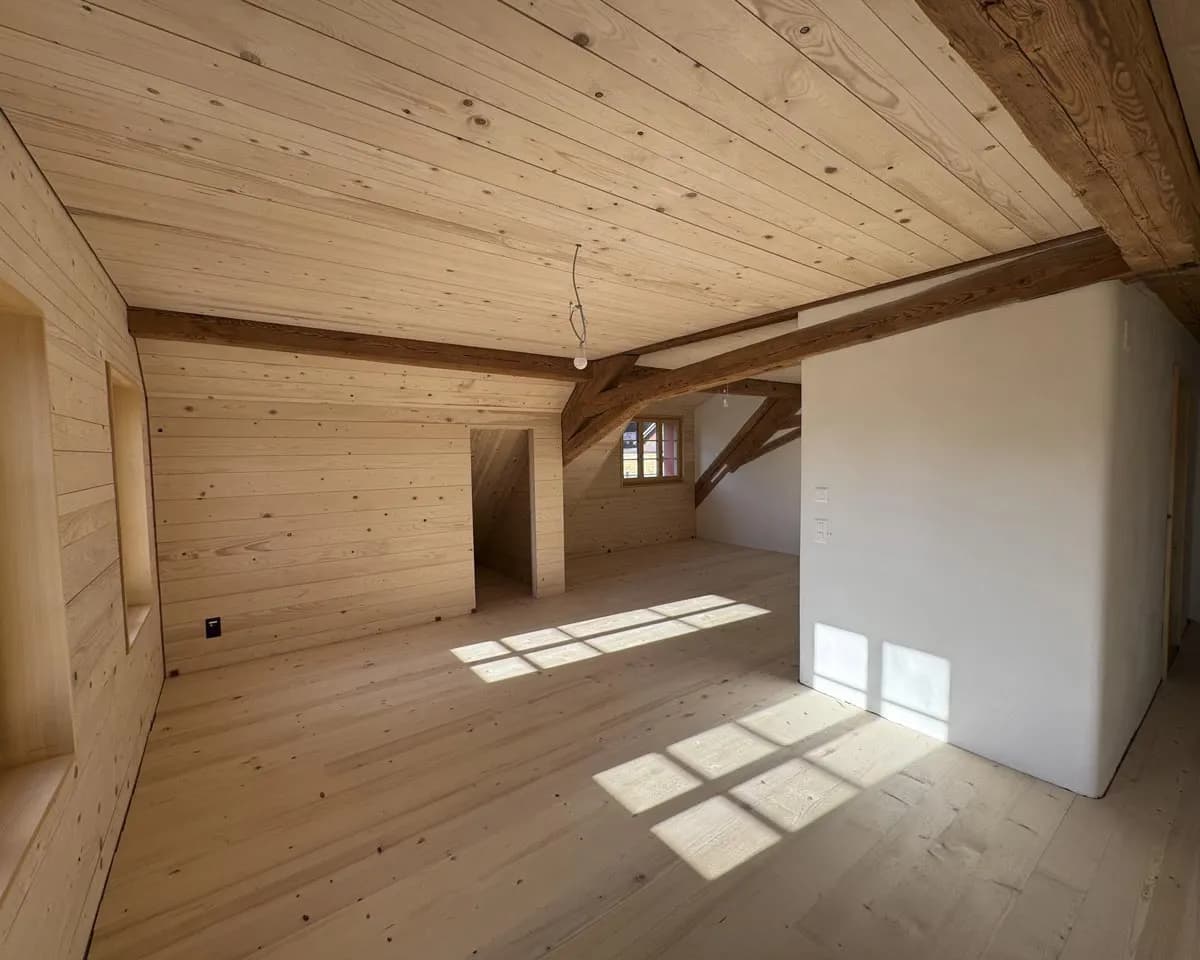Jede Wohneinheit besteht aus 1-2 Zimmern und einer Nasszelle. Zur gemeinsamen Nutzung steht der Wohn- und Essraum und ein Reduit im Erdgeschoss, das ganze Dachgeschoss, ein Bad mit Sauna, ein Gemüsekeller sowie der Garten zur Verfügung.