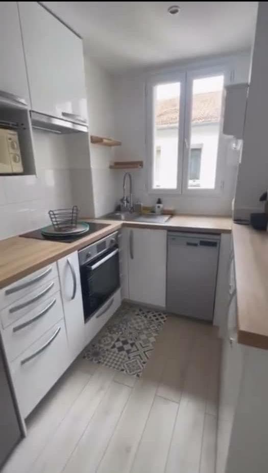 bureau, grand placard, petite bibliothèque. Cuisine : four combiné, plaque vitrocéramique, réfrigérateur, bouilloire électrique, vaisselle complète, beaucoup de