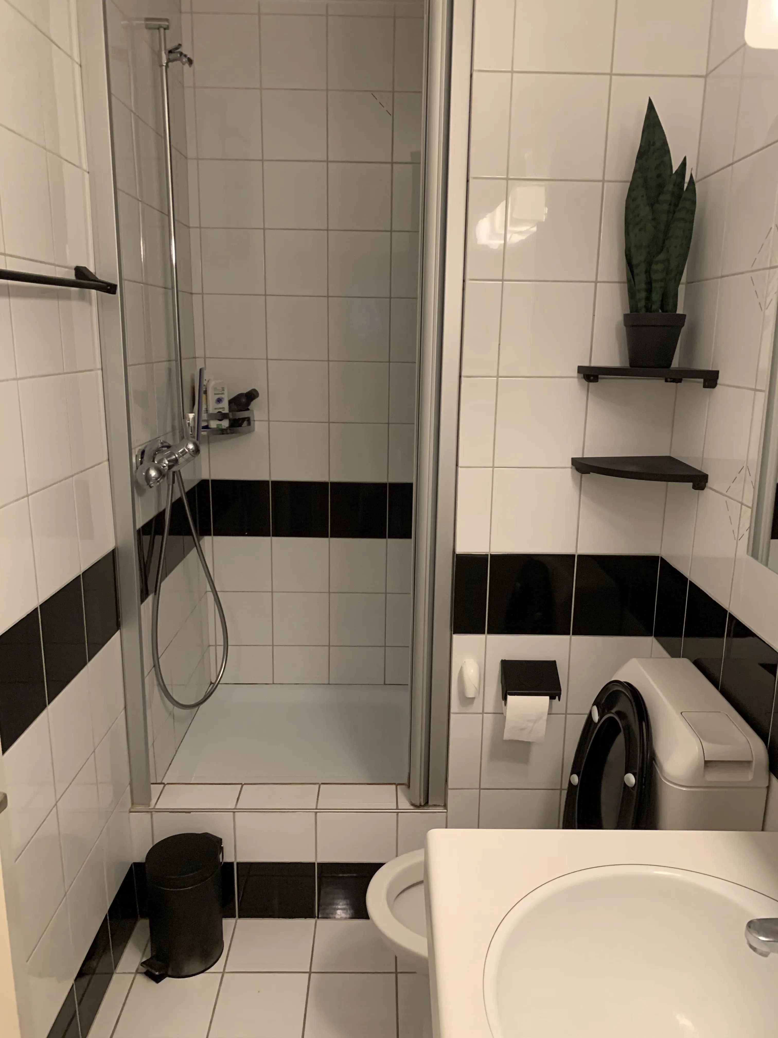 Modernes Badezimmer: Weiß gefliest mit Dusche, Toilette, stilvollem schwarzen Waschbecken und Spiegel, ergänzt durch dekorative Grünpflanzen.