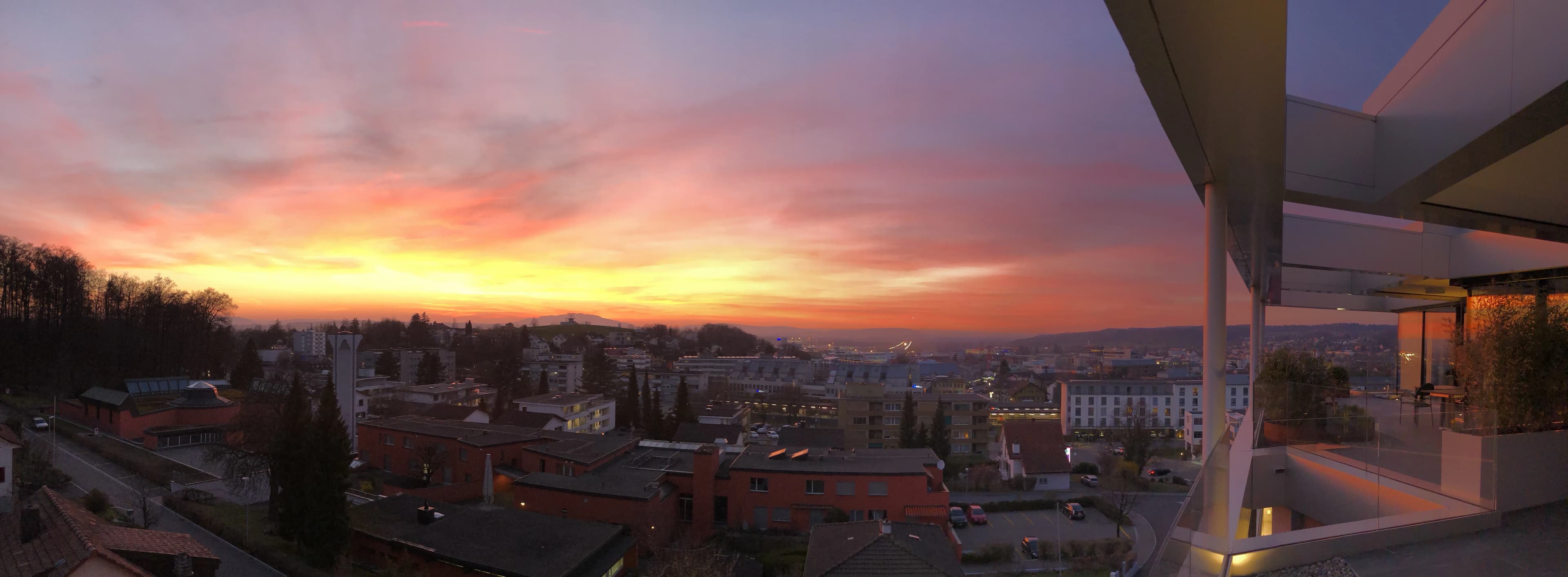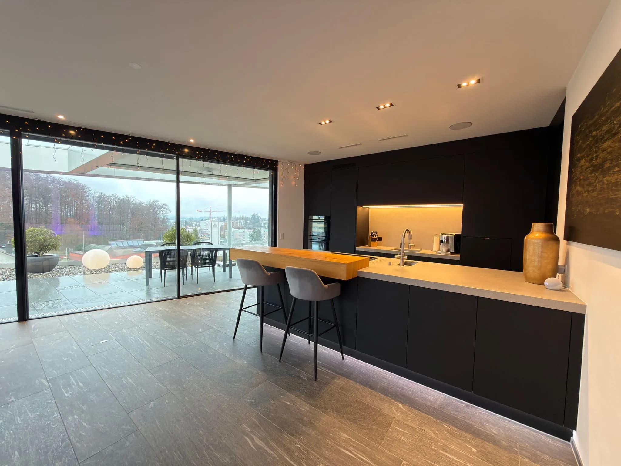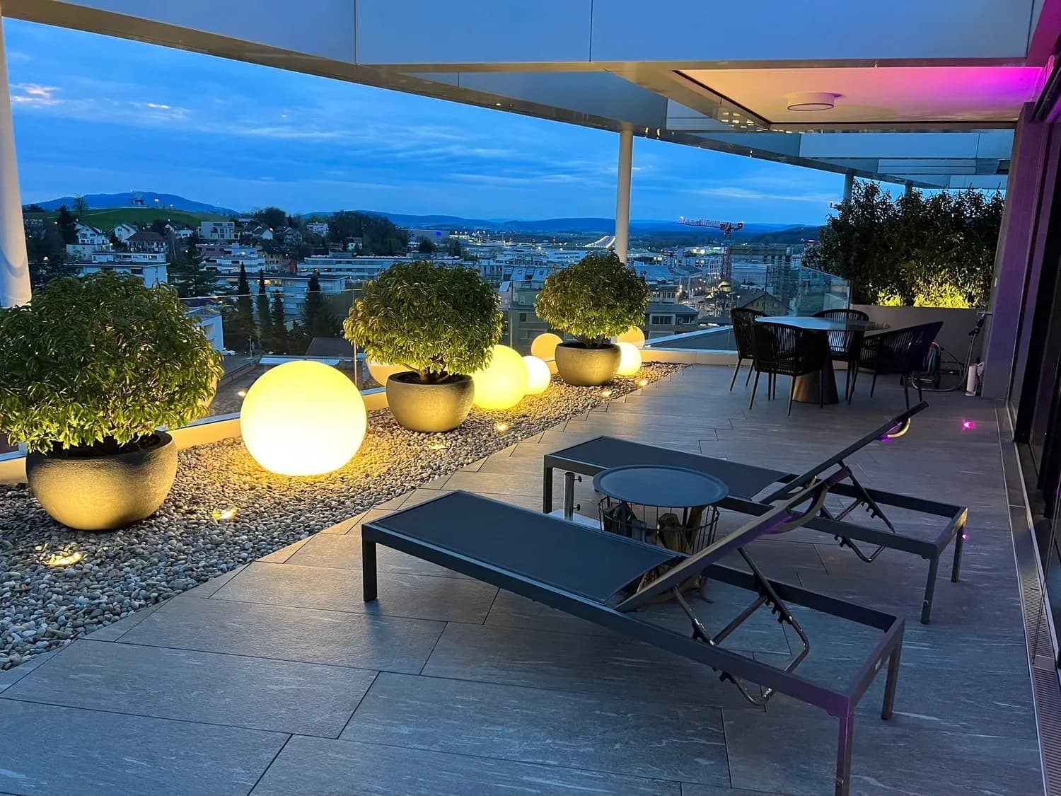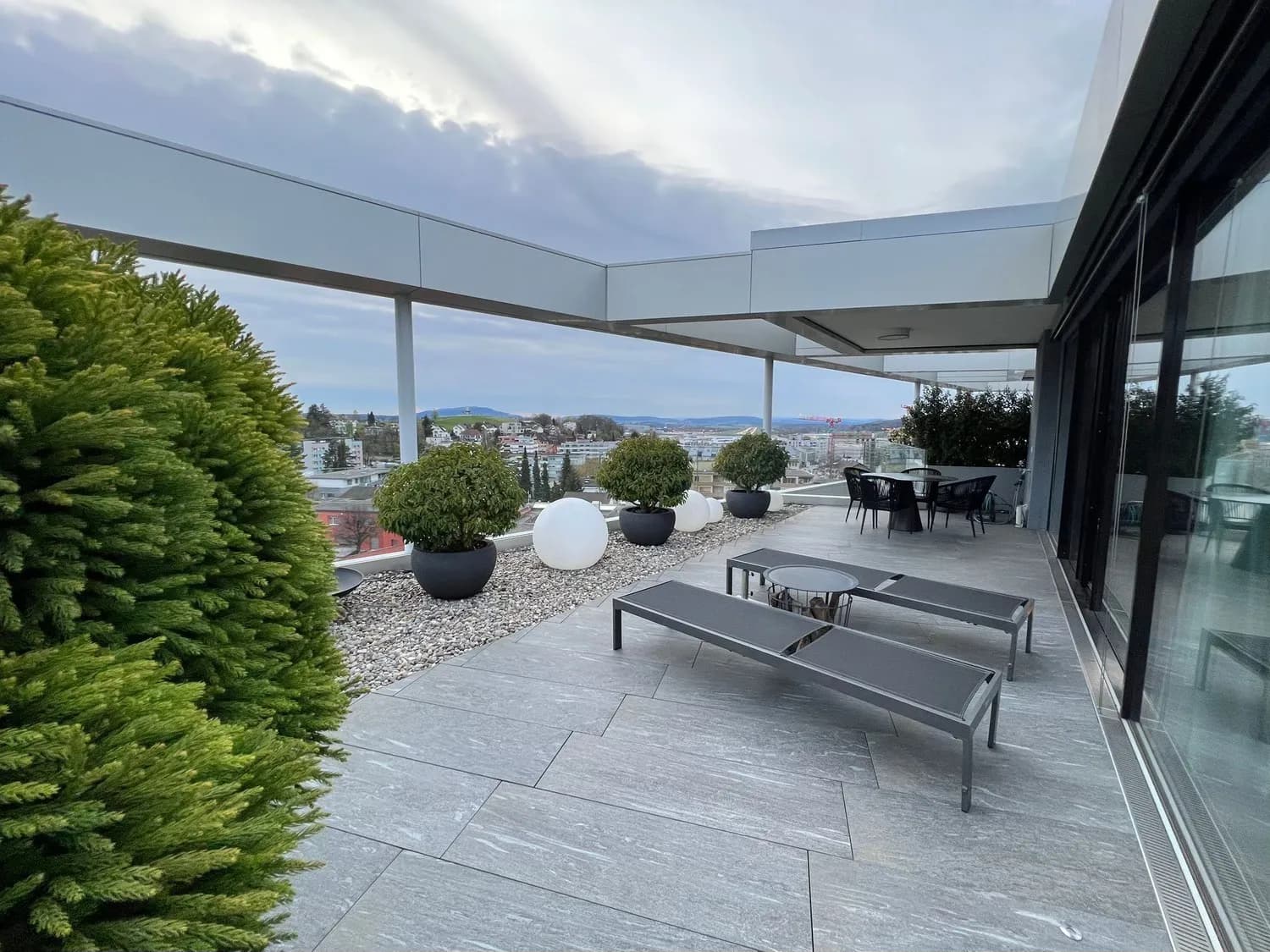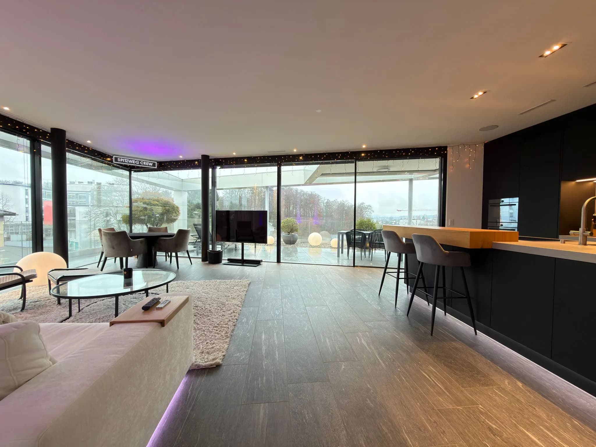 Wunderschöne und moderne Attikawohnung mit grosser Terrasse und faszinierendem Blick auf den Flughafen und die Sonnenuntergänge.