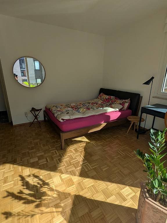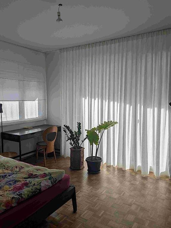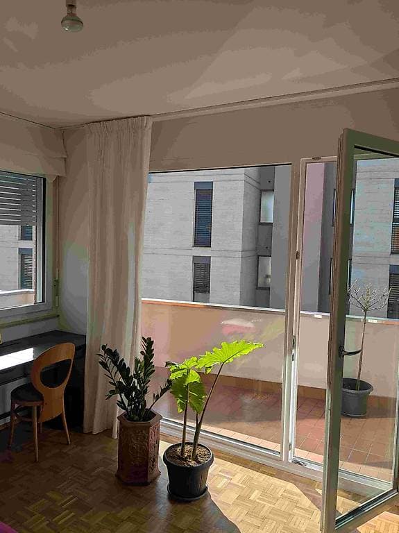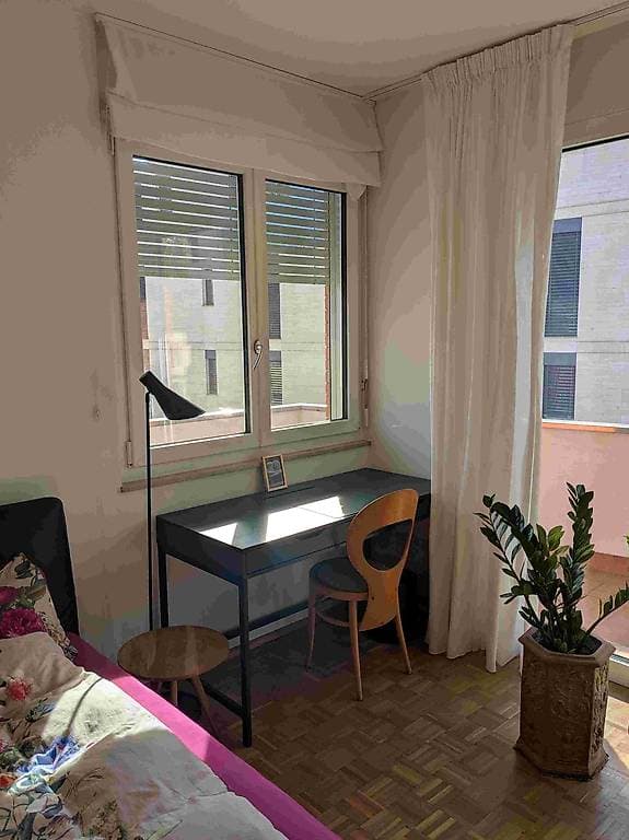 Molino Nuovo: Affittasi spaziosa camera arredata (armadio, scrivania, letto) in appartamento al 5° e ultimo piano di una tranquilla palazzina anni '60. La stanza è molto luminosa, con esposizione a est e sud, e gode di un balcone privato.