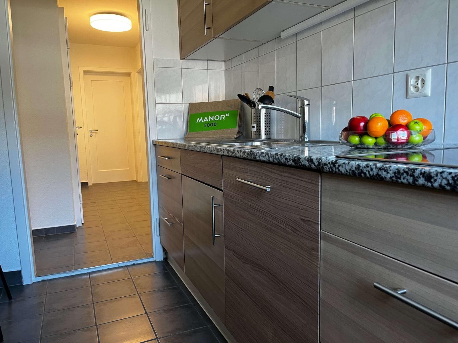 In der Nähe: Glattzentrum, Supermärkte, Bäckereien; gute Tram- und Busverbindungen