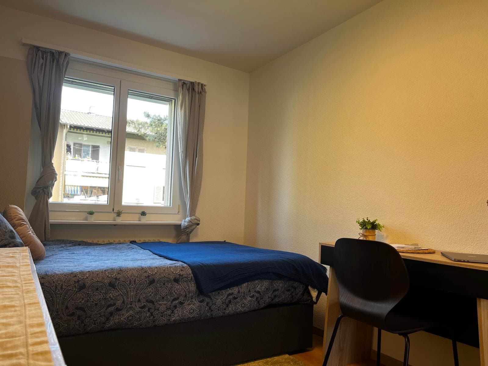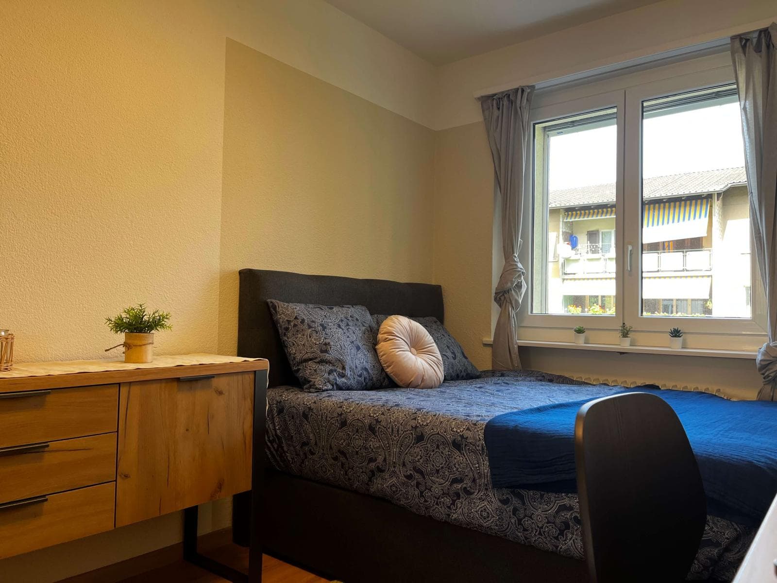 Helles, vollständig möbliertes Zimmer in einer frisch renovierten 4-Zimmer-Coliving-Wohnung im 1. Stock. Ruhige, grüne Lage, wenige Gehminuten zum Bahnhof Dübendorf, mit schneller Anbindung in die Stadt und zum Flughafen. CHF 890/Monat inklusive WLAN, Nebenkosten, Waschmöglichkeiten und Reinigung der Gemeinschaftsflächen.
