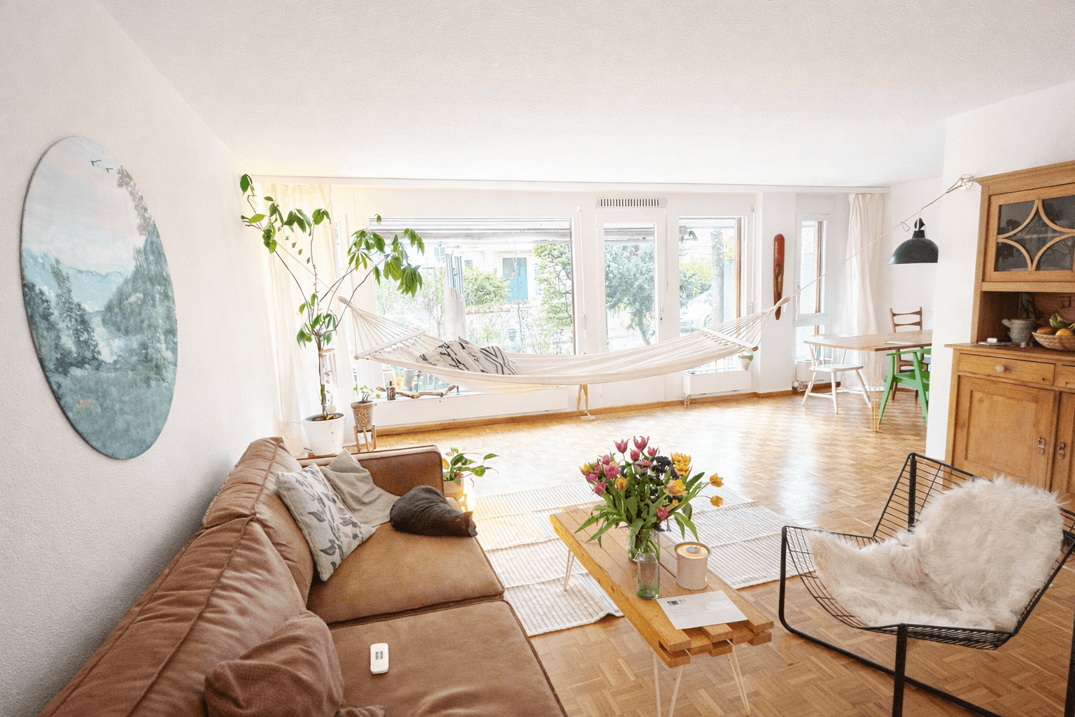 7 weeks onlineGemeinsam teilen wir uns ein schönes und grosses Wohnzimmer mit direktem Zugang zur Terrasse, die wir gemeinsam gestalten können.